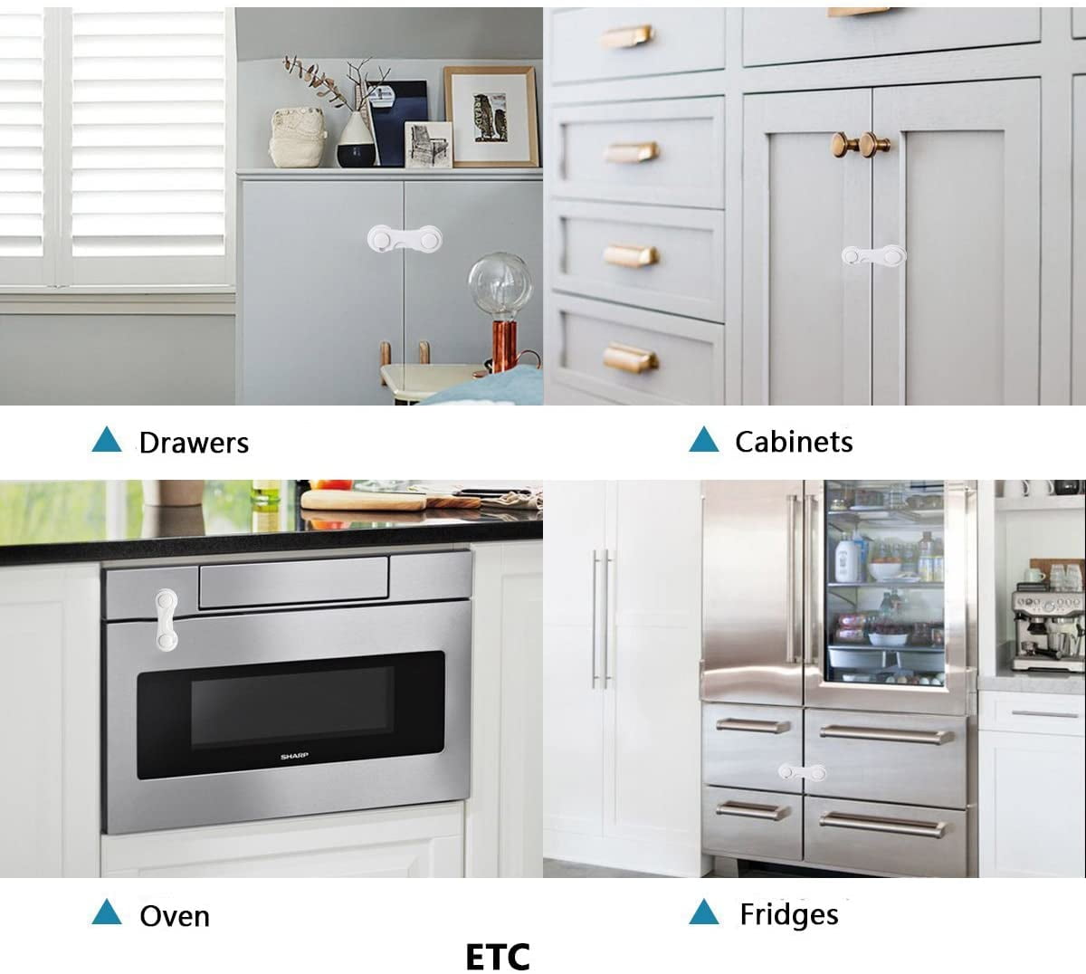 MULTI-PURPOSE: The safety cabinet locks are suitable for cabinets, drawers, doors, windows, refrigerators, ovens, toilet seats, trash cans, garbage, closet, microwave oven,washing machines, electrical appliances, etc. Unlike other products that can only be used in one place.