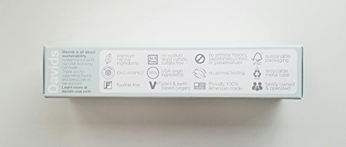 Davids is a premium natural toothpaste, made in California, with a focus on sustainability. Davids is simply the highest quality and best natural toothpaste made from naturally sourced and naturally derived ingredients to safely whiten teeth, fight plaque, and freshen breath. With regular brushing, naturally derived micro abrasives assist to reduce plaque and surface stains creating whiter teeth and a clean and healthy mouth. Baking soda (sodium bicarbonate) is used to neutralize the acids in your mouth, which further reduces the bacteria causing plaque. Birch Xylitol is added to promote good oral hygiene. Premium mint oil from various mint growing regions across the USA are blended together to create an amazing mint flavor and freshen breath. Davids went out of their way to use 98% USA Origin Ingredients to produce the highest quality toothpaste possible and to support USA jobs! Discover why so many people are switching to Davids!