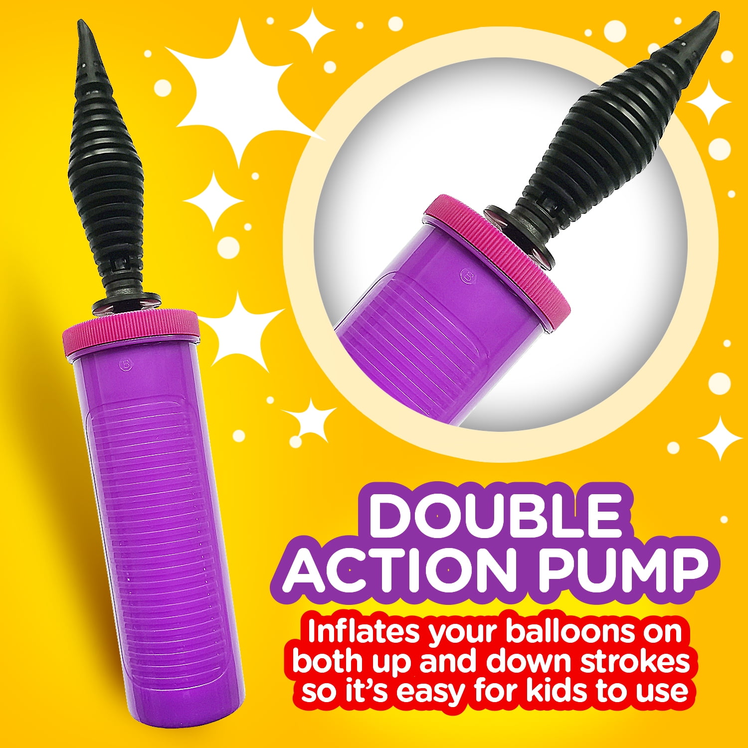 - CHILD FRIENDLY, EASY TO USE DOUBLE ACTION PUMP – With this air balloon pump, it is easier for kids to inflate the balloons, so Mom and Dad can relax and enjoy the twisting balloon show! The pump makes inflating the balloons for balloon animals quick and simple because it inflates your balloons on both up and down strokes so it is easy for kids to use