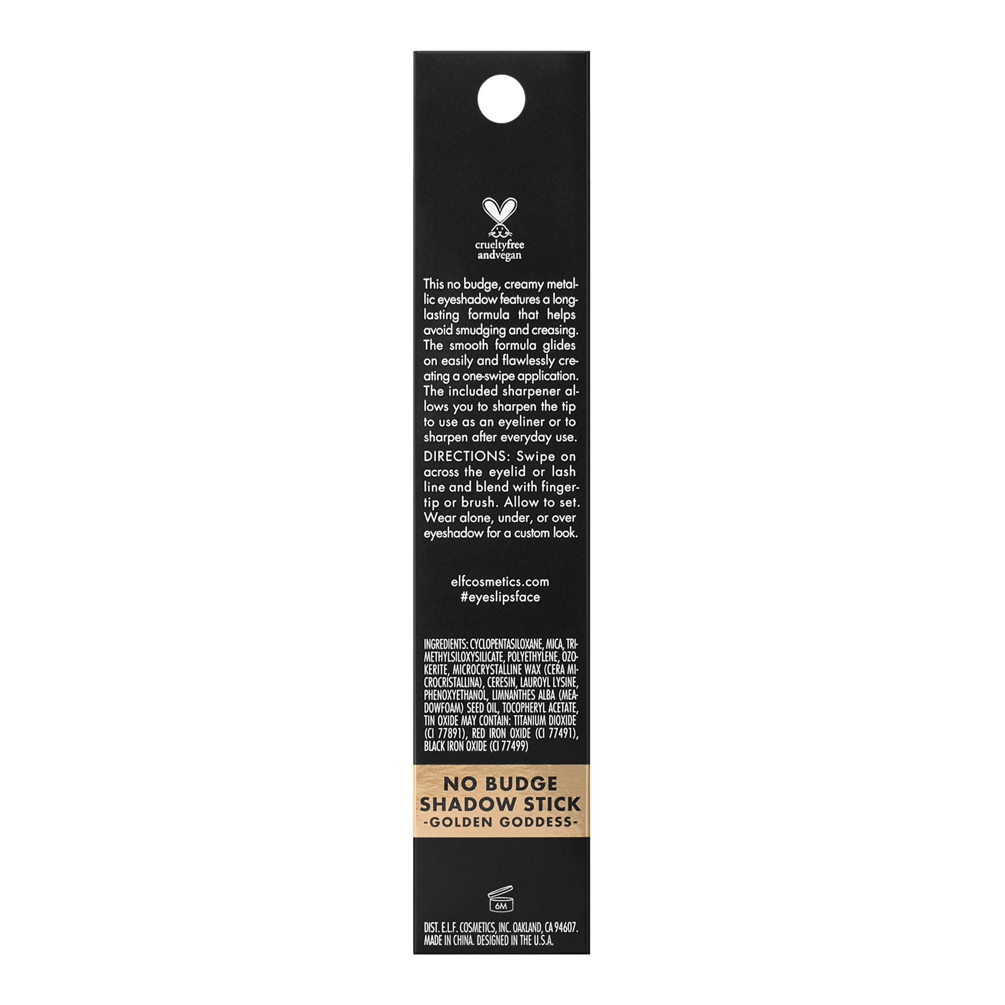 The e.l.f. No Budge Shadow Stick is a creamy metallic, no-budge eyeshadow that features a long-lasting formula that helps avoid smudging and creasing. The smooth formula glides on easily and flawlessly creating a one-swipe application.