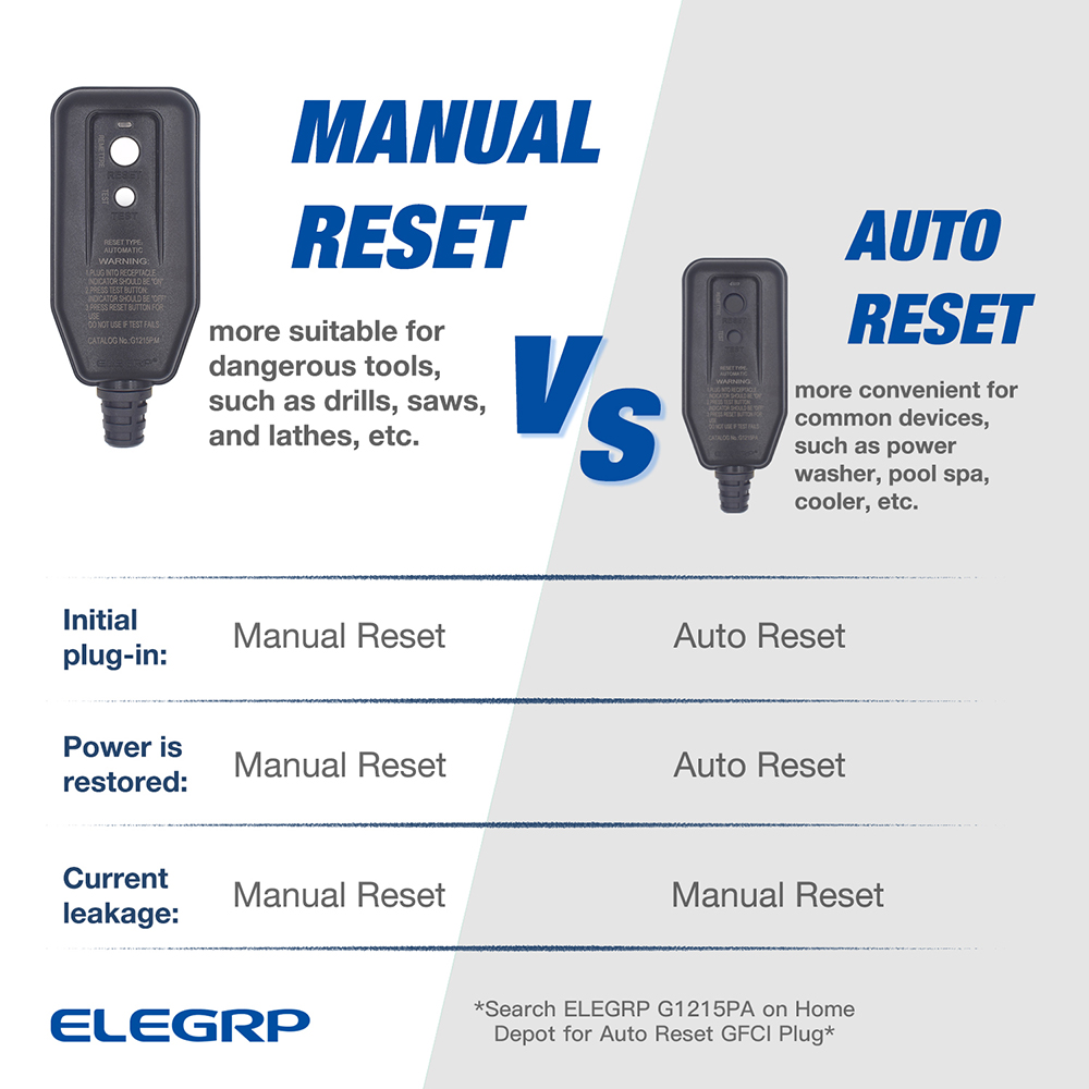 - Manual Reset – Manual Reset Cord Sets will need to press reset button after initial plug-in or after a power failure