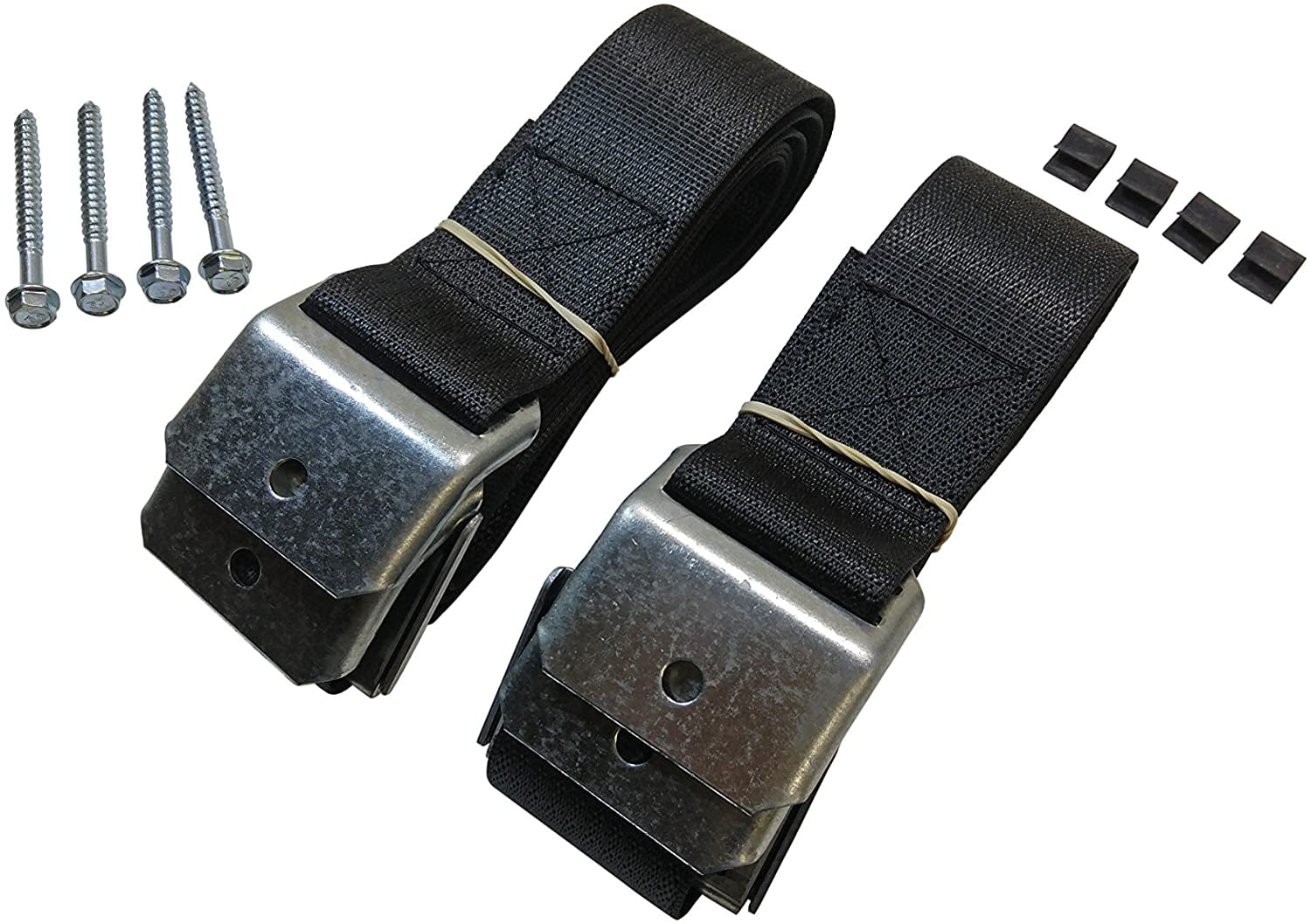 Front tensioning method water heater cloth style seismic strap. Includes 2 pairs of straps, 4 self-drilling stud lag screws, 4 belt clips. Rated for up to 80 gallon water heaters. Complies with all codes including DSA, State of California Architect Certification, UPC, and City of Los Angeles. Instruction printed on packaging.