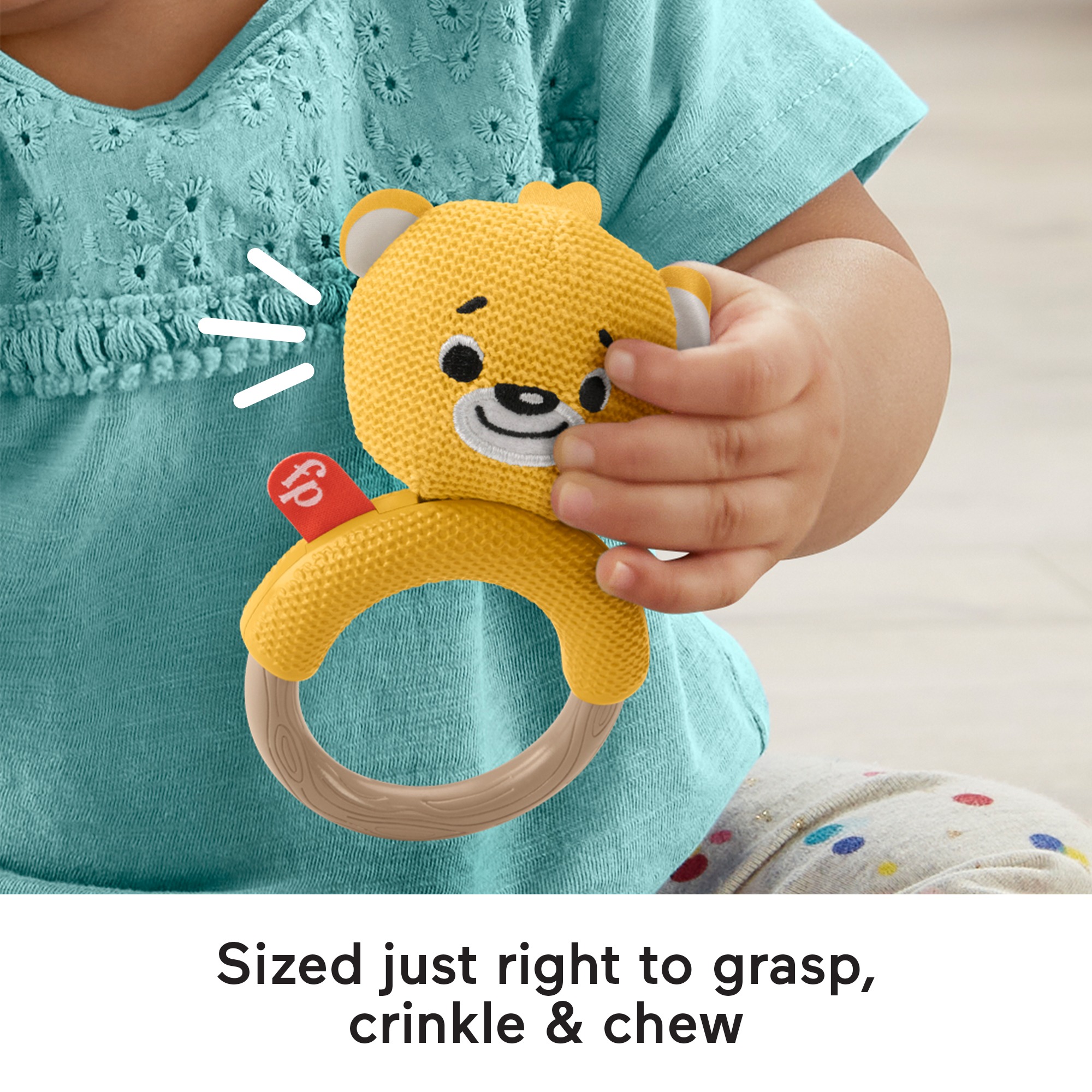 The Fisher-Price Knit Teether Bear toy features a friendly faced knit embroidered bear cub that crinkles when baby grasps and squishes. The stylish teething ring is BPA-free. The knit fabrics and crinkle sounds engage baby’s tactile and auditory senses, while grasping and moving the toy helps strengthen dexterity and hand-eye coordination.