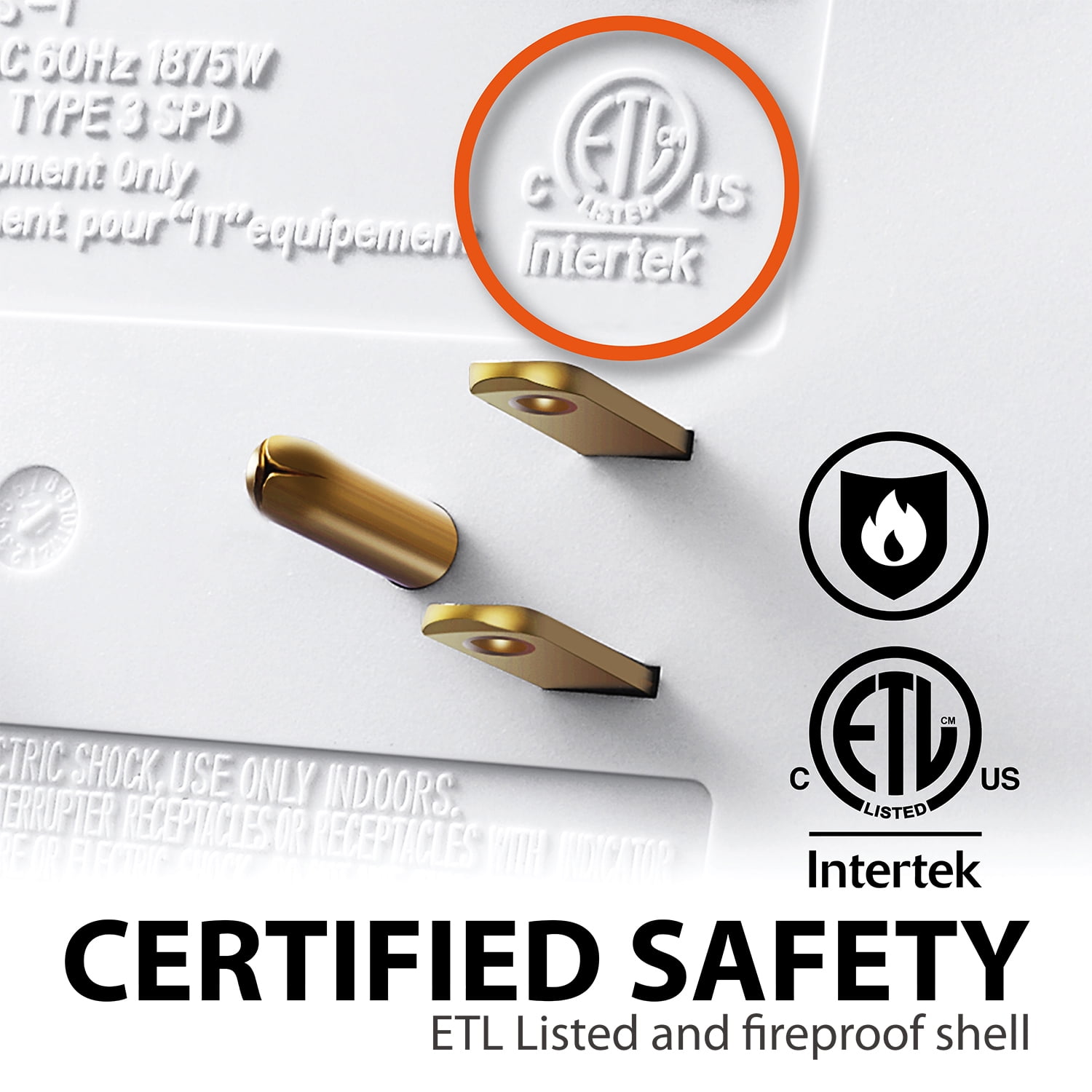 - [QUALITY CONSTRUCTION AND CERTIFIED SAFTEY] The safety of the surge protector is ETL certified and conforms to UL498A and UL1449 standards. The shell of the multi plug outlet is durable and fireproof, making it very safe to use.