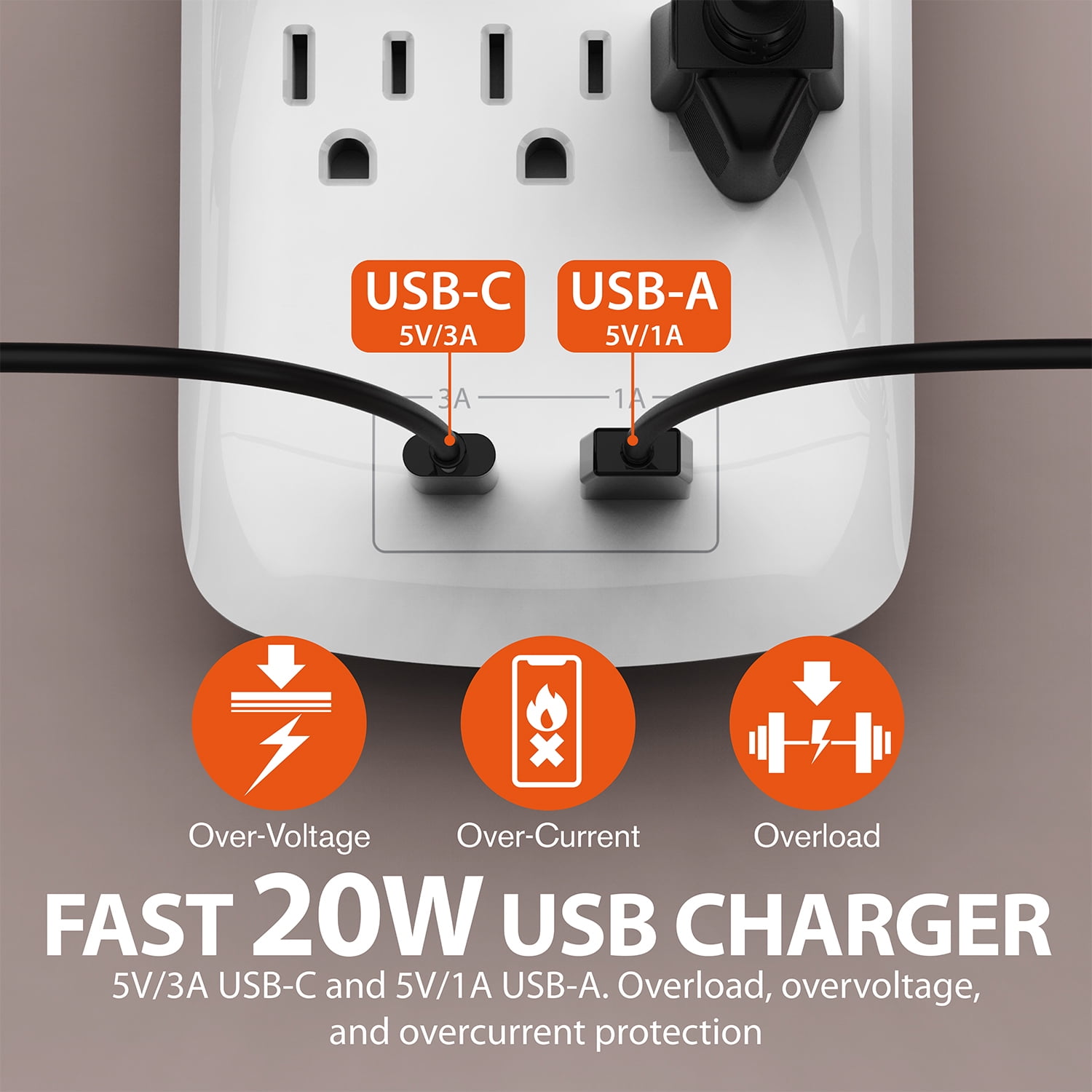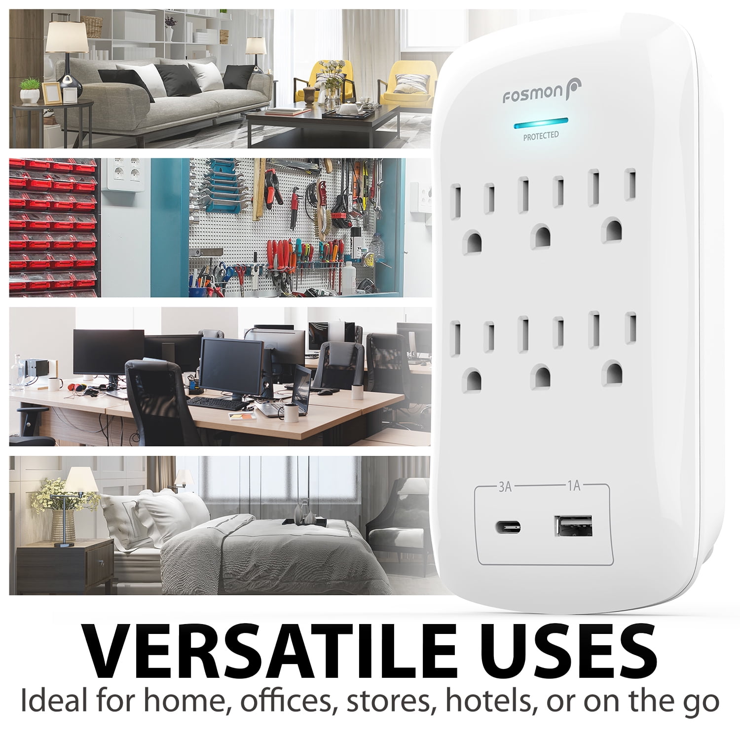 Fosmon’s 6 outlet surge protector triples the number of available outlets compared to a standard dual receptacle outlet. Simply plug the multi plug outlet into a wall outlet and you’re ready to power and charge up to 8 devices: 6 from AC outlets and 2 from USB-A and USB-C ports.