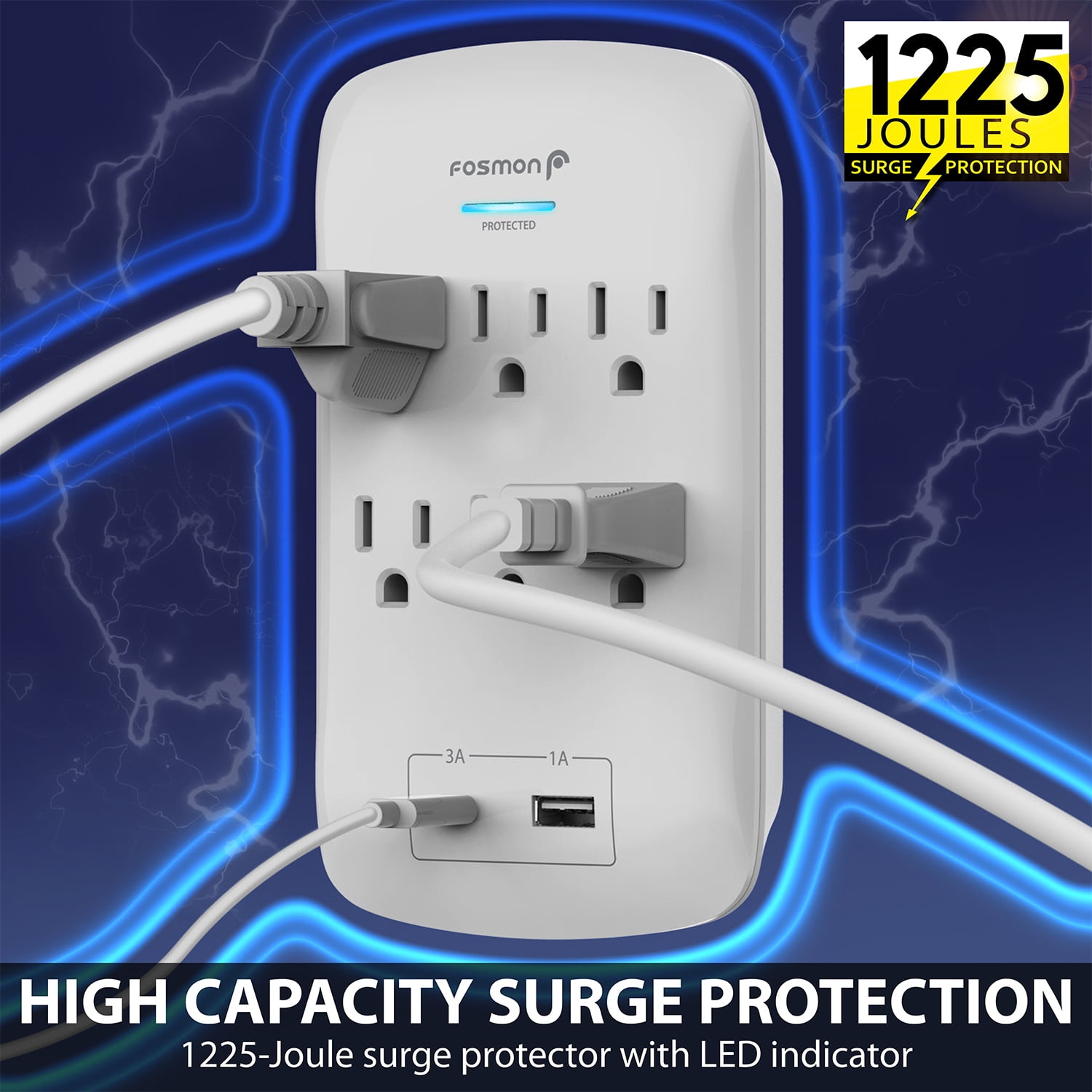The multi plug outlet comes with surge protection, which has a high capacity of 1225 joules. The blue LED light indicates that your surge protector is functioning properly. The USB charger will protect your phones or tablets against overload, overvoltage, and overcurrent.