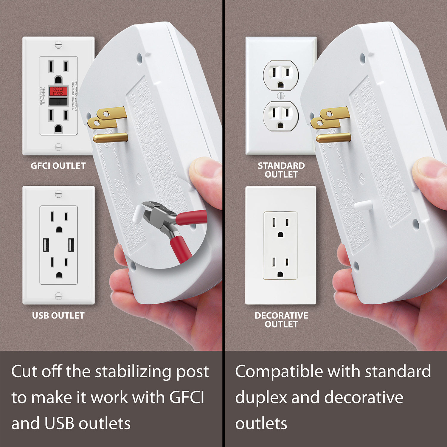 - [COMPATIBLE AND PORTABLE] The Fosmon surge protector is compatible with both standard and decorative outlets. When using it with GFCI or USB outlets, the stabilizing post might need to be cut off due to the larger gap between two sockets. The surge protector is compact and lightweight, making it great for homes, offices, hotels, stores, or for use on the go.
