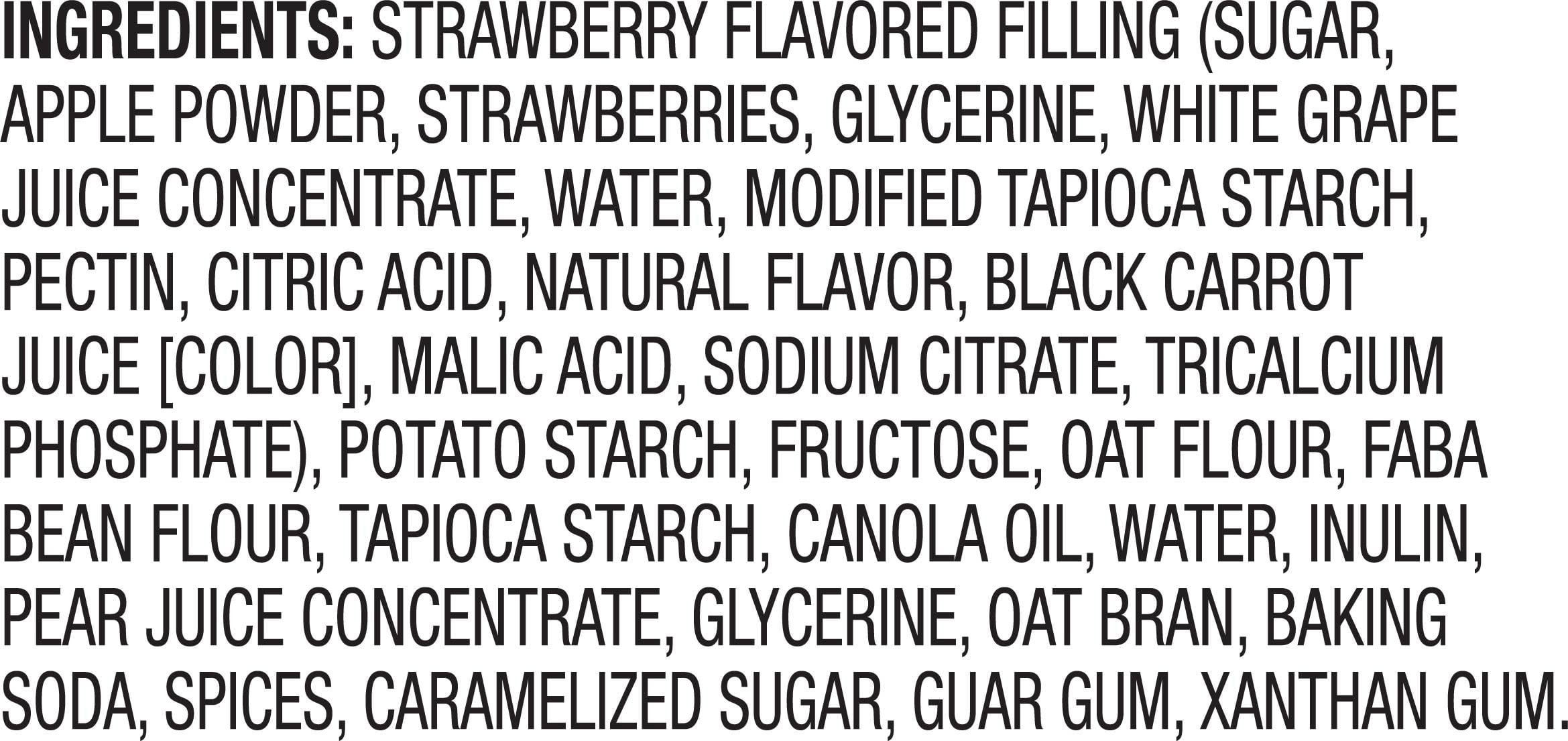 - INGREDIENTS: STRAWBERRY FLAVORED FILLING (SUGAR, APPLE POWDER, STRAWBERRIES, GLYCERINE, WHITE GRAPE JUICE CONCENTRATE, WATER, MODIFIED TAPIOCA STARCH, PECTIN, CITRIC ACID, MALIC ACID, NATURAL FLAVOR, TRICALCIUM PHOSPHATE, BLACK CARROT JUICE FOR COLOR, SODIUM CITRATE), CHICK PEA FLOUR, POTATO STARCH, FRUCTOSE, PEAR JUICE CONCENTRATE, RAISIN PASTE, INULIN, CANOLA OIL, TAPIOCA STARCH, WHITE RICE FLOUR, WATER, SODIUM BICARBONATE.
