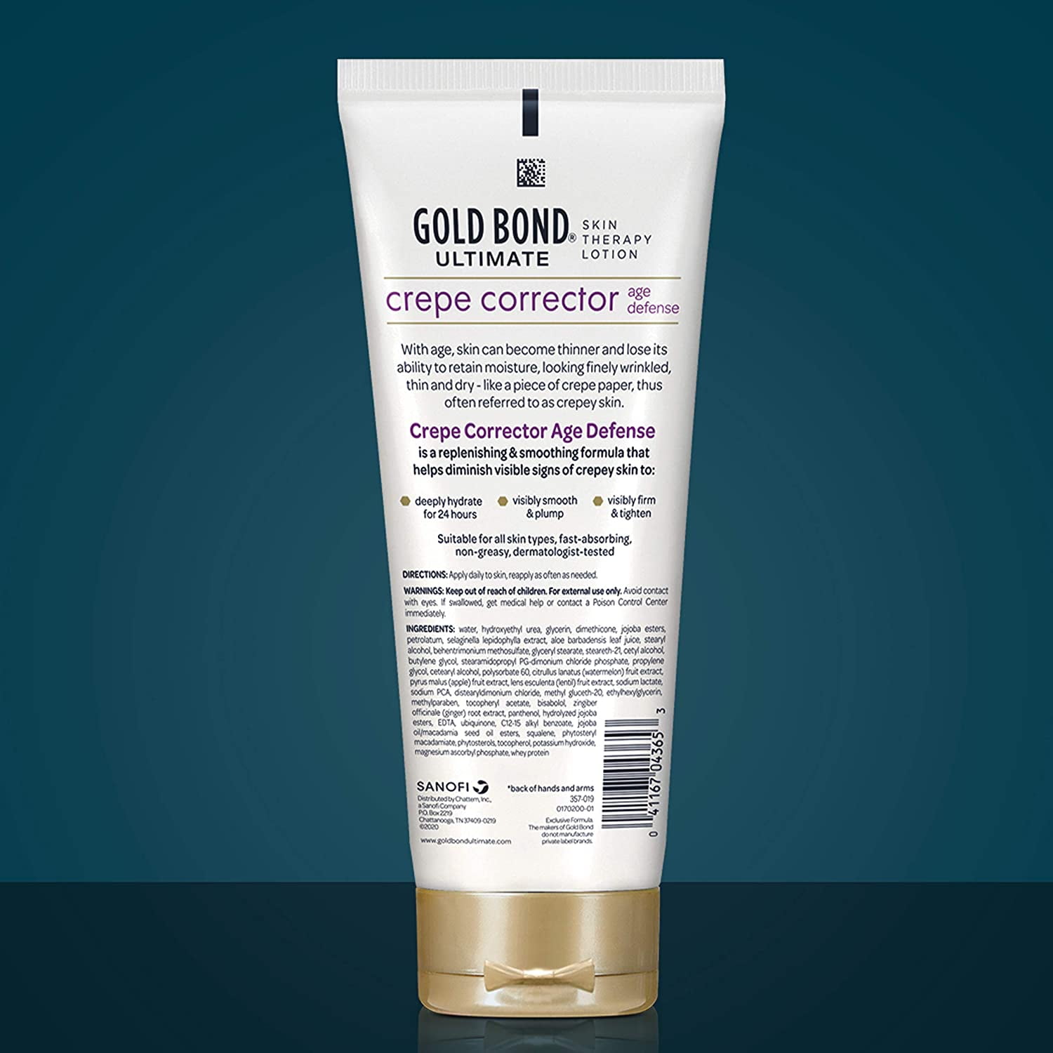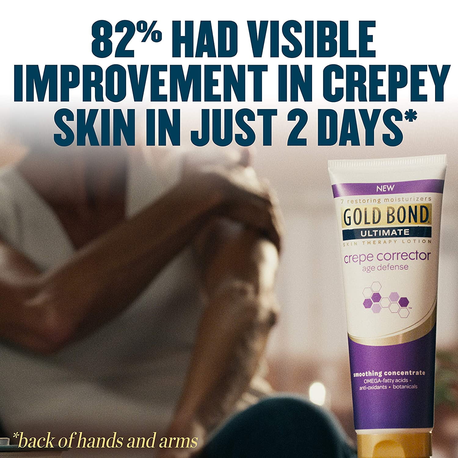 Contains one (1) 8-oz. bottle of Gold Bond Ultimate Crepe Corrector Age Defense Smoothing Concentrate Gold Bond Crepe Corrector Lotion helps diminish visible signs of crepey skin, such as fine, thin wrinkles This unique smoothing concentrate features protective anti-oxidants, powerful botanicals and nourishing omega-fatty acids Gold Bond Lotion for Crepey Skin moisturizes skin for 24 hours for lasting hydration This lightweight lotion is fragrance free, fast absorbing, non-greasy and tested by dermatologists