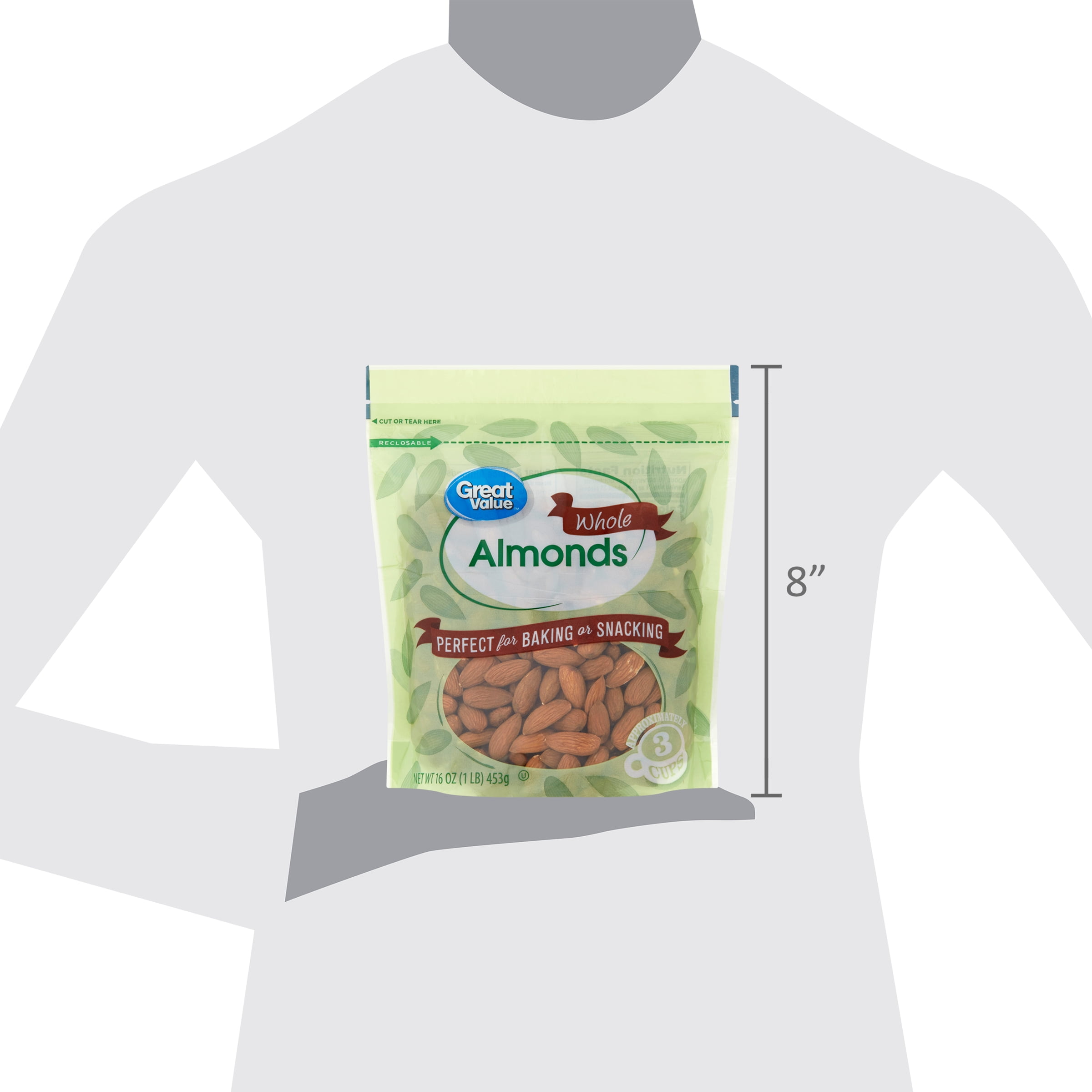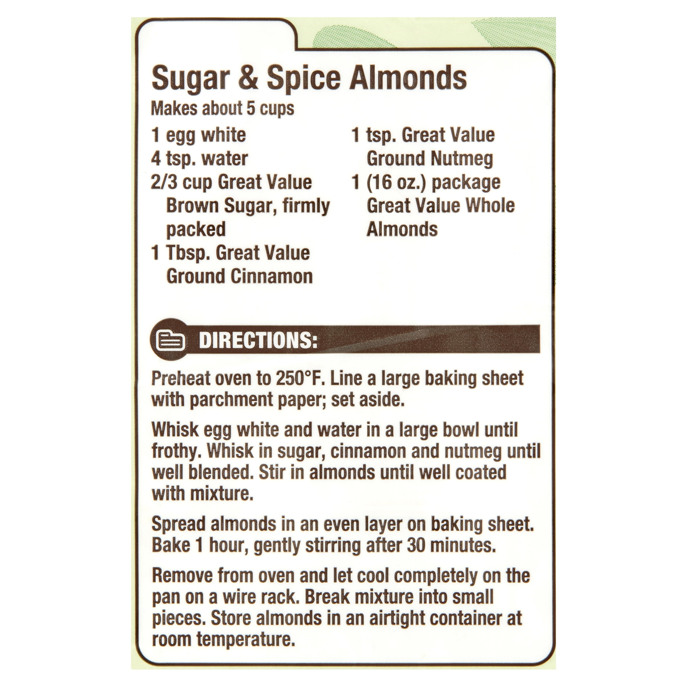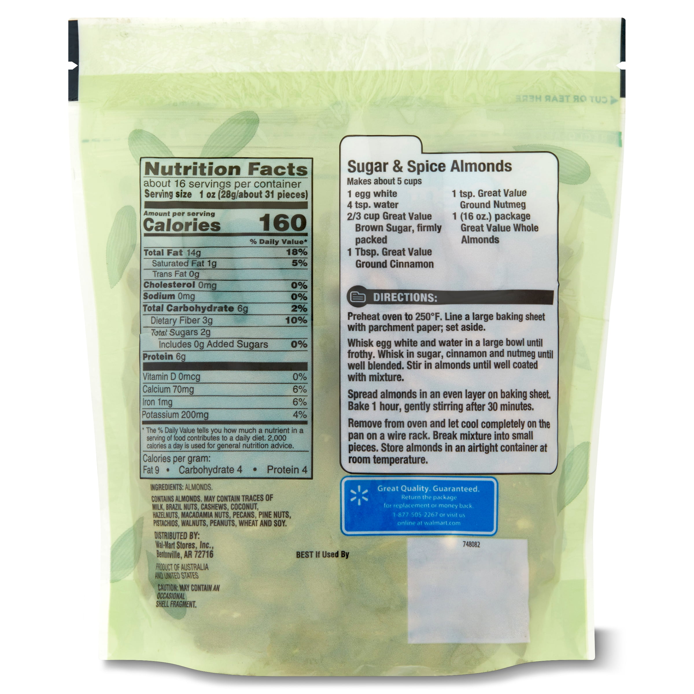 Get creative in the kitchen and try out new snack recipes with our Great Value Whole Almonds. Who doesn’t love a good cinnamon-coated almond? With these perfect-for-baking almonds, you can whip up your very own spice blend and create some of your favorite snacks all in the comfort of your own home. Almonds are a rich source of healthy fats and proteins, which makes them excellent for casual snacking as well as additional ingredients to enhance the texture and flavor of your salads and home-baked treats. Plus, we even included a unique recipe for an Orange Almond Smoothie right on the back of the packaging to help get your creative juices flowing. For fresh ideas in the kitchen, look to our Great Value Whole Almonds.Great Value products provide families with affordable, high quality grocery and household consumable options. With our wide range of product categories spanning grocery and household consumables, we offer you a variety of products for your family’s needs. Our products are conveniently available online and in Walmart stores nationwide, allowing you to stock up and save money at the same time.