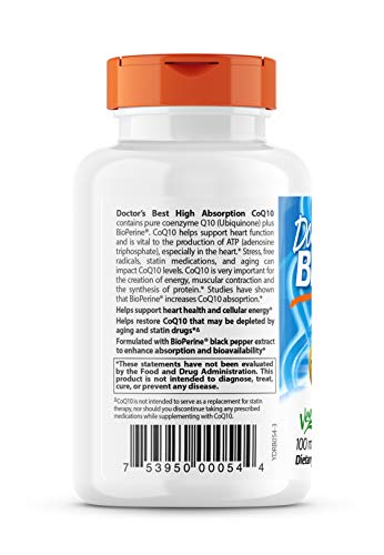 Dietary Supplement. Gluten free. Soy free. USP Verified, naturally fermented CoQ10. Non-GMO. Science-based nutrition. Helps restore CoQ10 that may be depleted by aging or statin drugs. Doctor’s best high absorption CoQ10 contains pure coenzyme Q10 (Ubiquinone) plus bioperine, CoQ10 helps support heart function and and promote energy production in the cells. It is vital to the production of ATP (adenosine triphosphate), especially in the heart. Stress, free radicals, statin medications and aging can impact CoQ10 levels. CoQ10 is very important for the creation of energy, muscular contraction and the synthesis of protein. Studies have shown that Bioperine increases C0Q10 absorption. Helps promote cadiovascular health and cellular energy. Help restore c0Q10 that may be depleted by aging and cholesterol lowering drugs (statins). Helps provide energy for those feeling occasional fatigue formulated with bioperine black pepper extract to enhance absorption and biovailability. www.drbvitamins.com. (These statements have not been evaluated by the Food and Drug Administration. This product is not intended to diagnose, treat, cure, or prevent any disease.)
