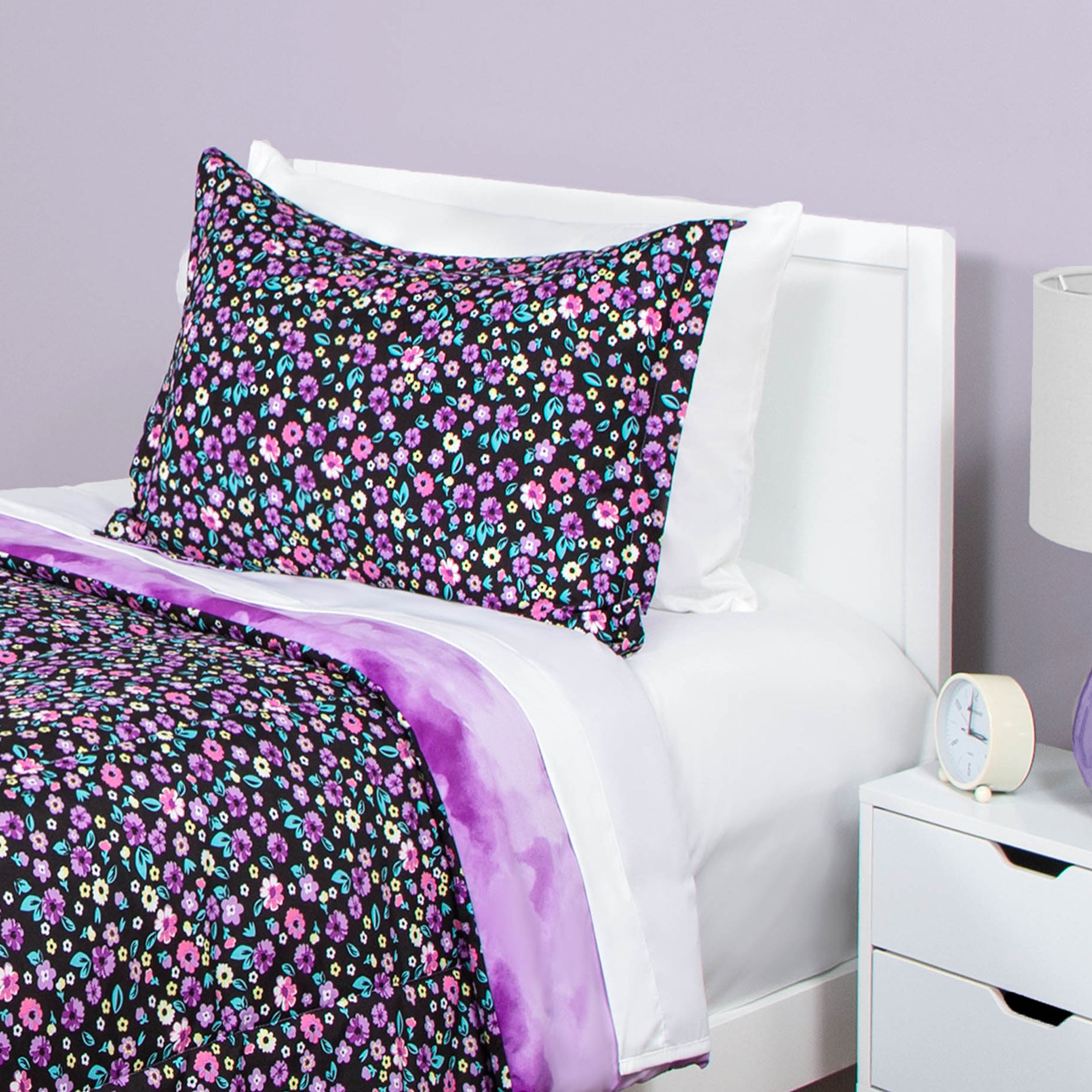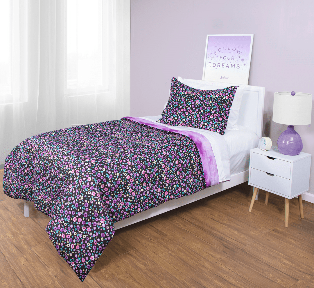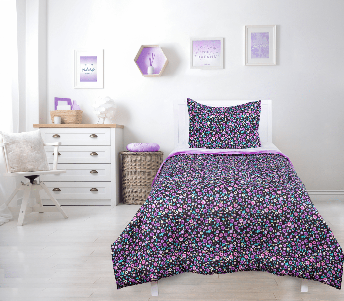 Justice Ditzy Floral Twin Comforter and Sham Set, 100% Microfiber, Purple