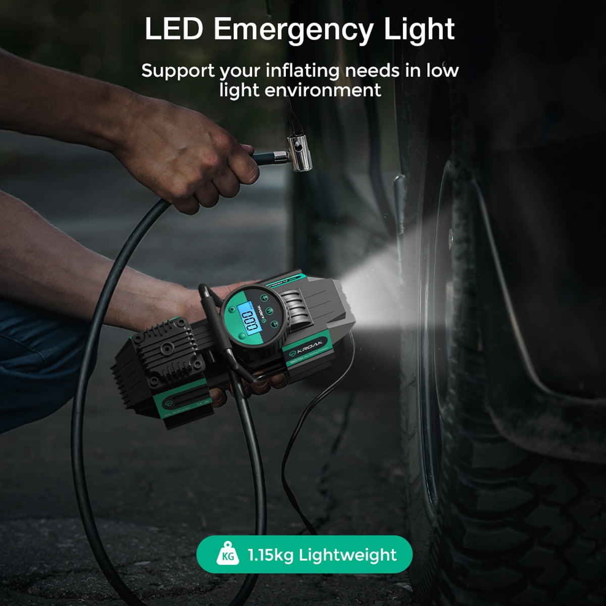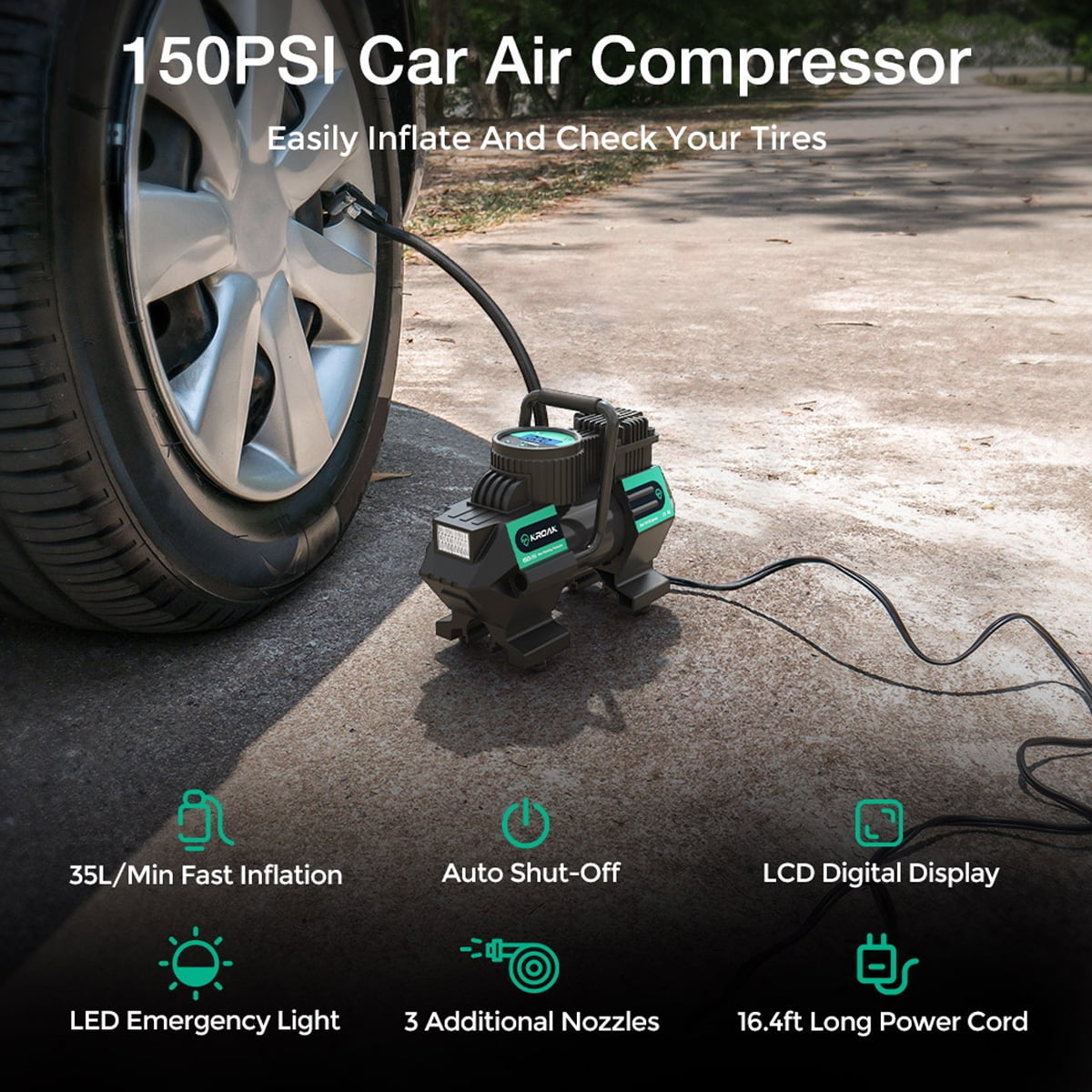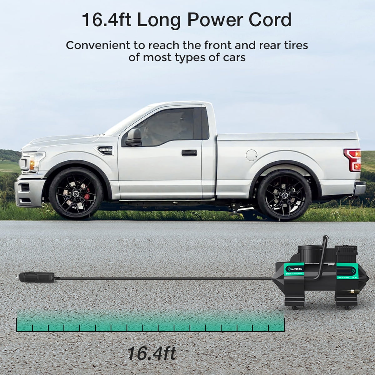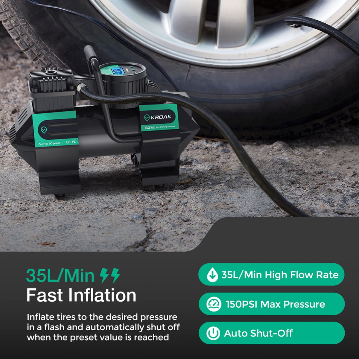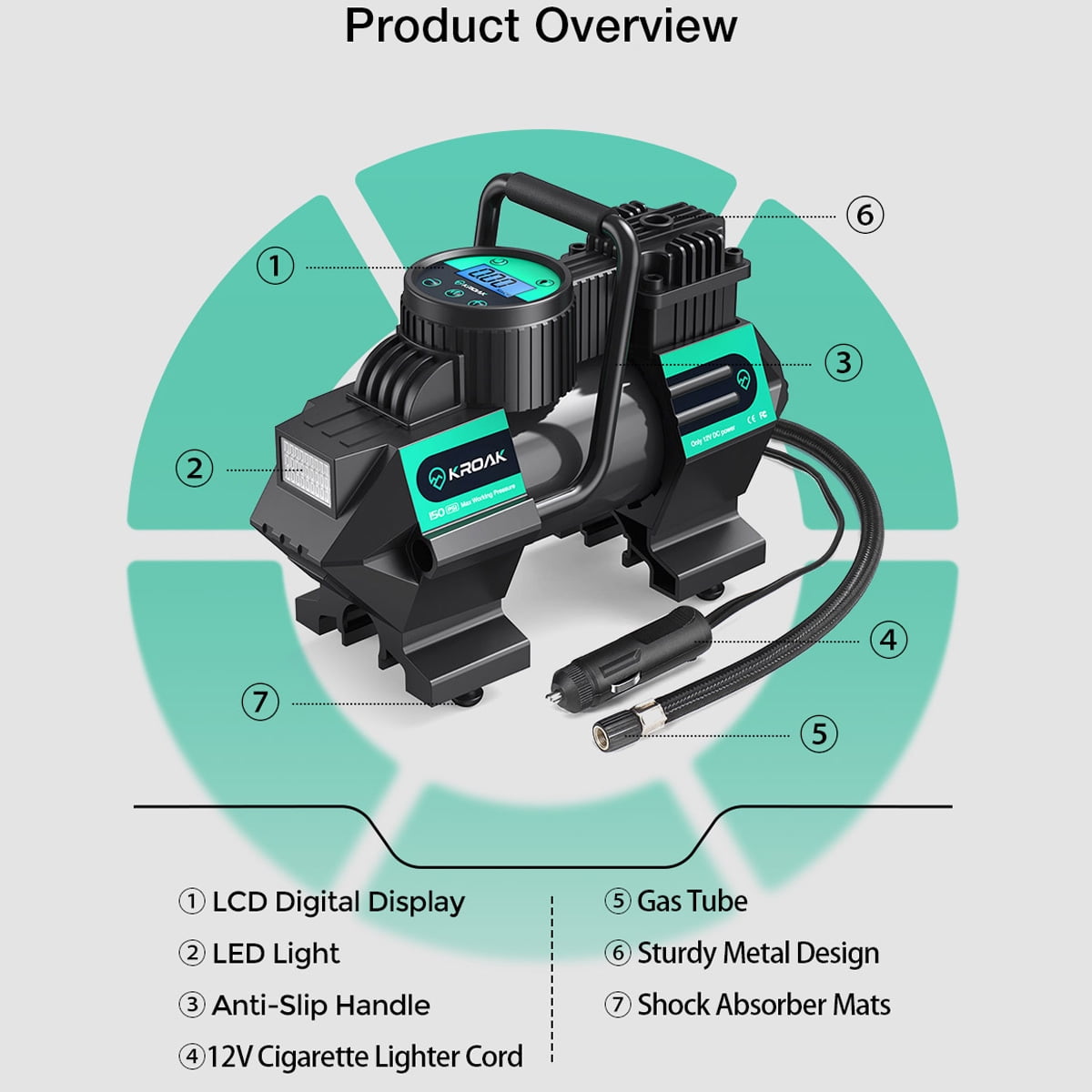 1. Fast inflation and automatic closing: The KROAK air pump inflates tires to standard pressure in minutes and automatically shuts off when a preset value is reached. No more worrying about over-inflation. Suitable for pneumatic tires for automobiles, MPVs, bicycles, cars, and medium-sized off-road vehicles. It can also inflate balls, balloons, inflatable kayaks, air mattresses, etc. 2. Portable and compact: Smaller but stronger than other air pumps on the market. Portable and compact design makes it easy to lift and carry. The 16.4-foot (about 5 meters) power cord has a built-in fuse and is long enough to reach the rear tire. Keep this air compressor in your car and use it anytime. 3. Easy to use: Start the car ignition, connect the car plug to the 12V DC power outlet, set the desired value, and wait for the LCD display to stop flashing. Flip the switch to the ON position, when the preset value is reached, the air compressor will automatically stop. A great solution for emergencies. 4. Digital Display & LED Lighting: 4 pressure measurement units – PSI, KPA, BAR, KG/CM2. The tire pressure will be displayed on the screen of the air pump for better control of the pressure when inflating the tire for safety. In addition, this air pump is also equipped with LED lighting function, which can meet the inflation needs in low-light environments. 5. Multiple uses: Inflate and deflate, and also measure tire pressure. Comes with replacement fuses and 3 types of nozzles, Not only for cars, but also for motorcycles, bicycles, ATVs, jeeps, sports balls, air mattresses and inflatable adapters. 16.4 feet (about 5 meters) long power cord is enough to connect all your tires.