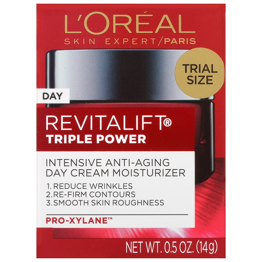 Why is This Product Right for Me? As skin ages. it loses its ability to efficiently reduce visible signs of aging. As skin loses firmness and its capacity to retain moisture. wrinkles and rough texture become even more pronounced. and skin on face. neck and jawline begin to sag.The Innovation Revitalift Triple Power Intensive Anti-Aging Moisturizer helps transform the look of aging by combining a day cream formula with concentrated anti-aging ingredients:Pro-Xylane: A powerful and exclusive anti-aging ingredient developed by L’Orеal Paris Laboratories. Hyaluronic Acid:A naturally occurring skin hydrating substance that holds water 1000x its weight.See Visible Results: Immediately: Skin is deeply hydrated all day. Complexion looks more radiant. In 1 Week: Wrinkles are visibly reduced. Skin feels firmer. more resilient. Skin looks younger and rough texture is noticeably smoothed. Skin’s overall appearance is significantly improved. Dermatologist tested for safety Suitable for all skin types. even sensitive Trial Size 1. Reduce Wrinkles 2. Re-firm Contours 3. Smooth Skin Roughness Because you’re worth it. How to Use: Every morning and evening. smooth over the face. neck and jawline until thoroughly absorbed. For best results. use in conjunction with other RevitaLift products.L’Oreal Paris Revitalift Triple Power Day/ Night Cream