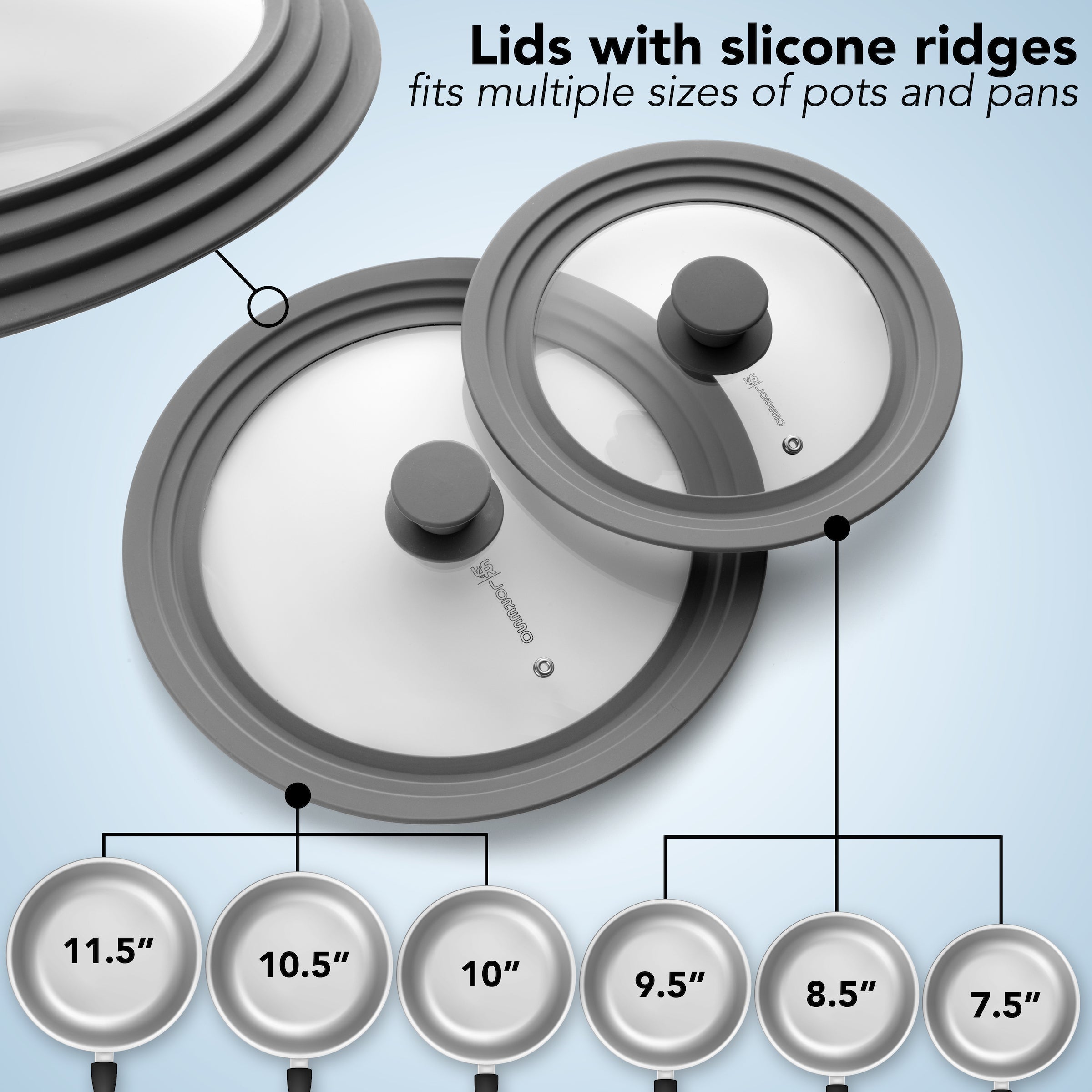 LORESO Silicone Glass Lid Grey Pack of Two – Universal Silicone Glass Lid for Pots Pans & Skillet 8 to 11 Inches, Tempered Glass Lid with Steam Vent, Food Safe Silicone