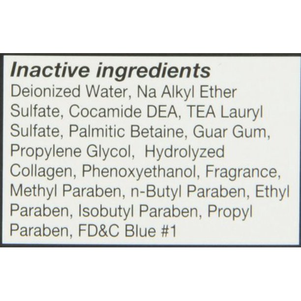 Active Ingredients: Coal Tar (3%, Psoriasis, Seborrheic Dermatitis, Dandruff Treatment*) Inactive Ingredients: Deionized Water, Na Alkyl Ether Sulfate, Cocamide DEA, TEA Lauryl Sulfate, Palmitic Betaine, Guar Gum, Propylene Glycol, Hydrolyzed Collagen, Phenoxyethanol, Fragrance, Methyl Paraben, n Butyl Paraben, Ethyl Paraben, Isobutyl Paraben, Propyl Paraben, FD&C Blue 1