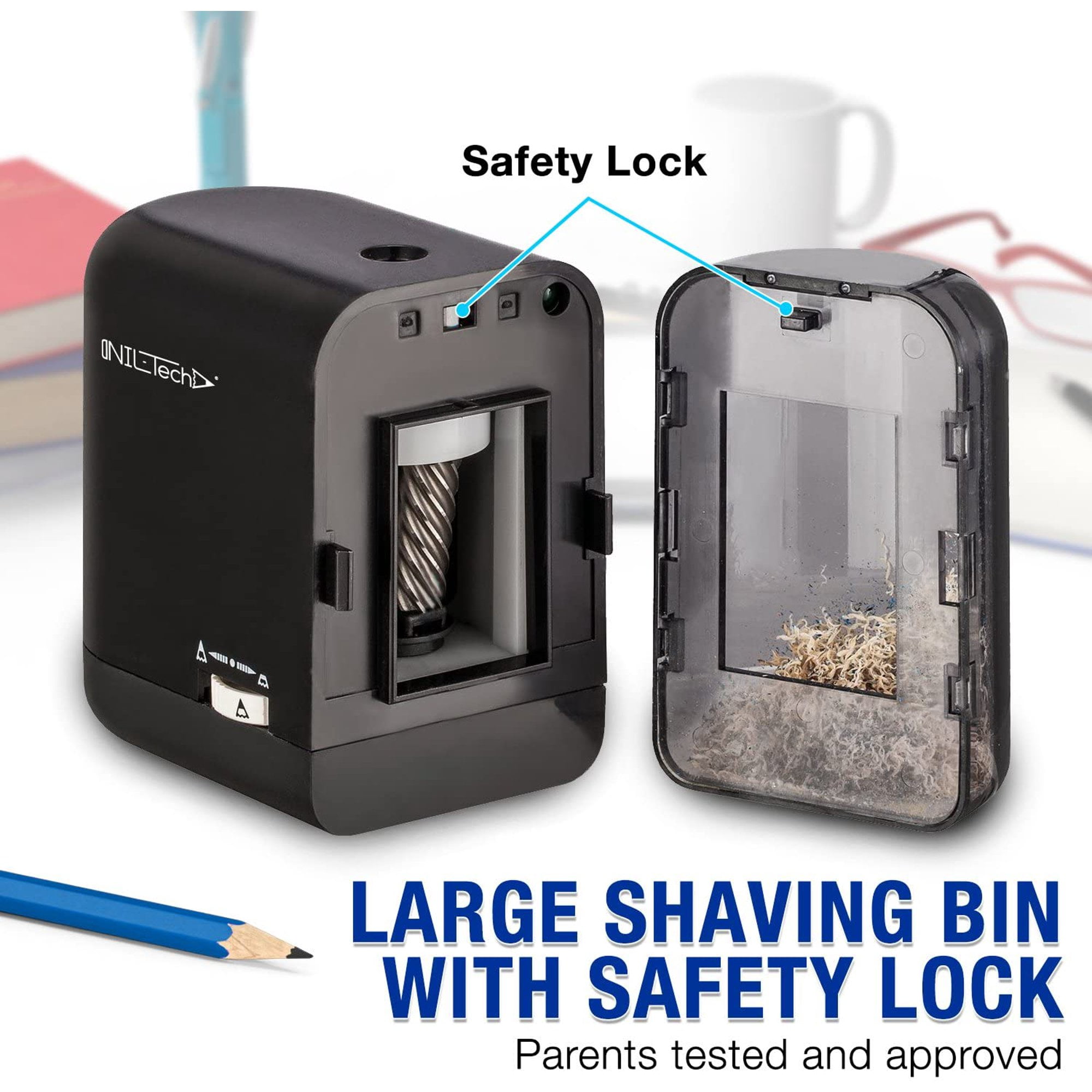 - SAFE FOR EVERYONE – At NIL Tech, we place a high value on safety. Our pencil sharpener is designed to stop operating when the shaving cover is removed, protecting both big and little fingers from becoming entangled in the blades. The large-capacity shavings tray can hold up to four times the amount of wood chips or sawdust.