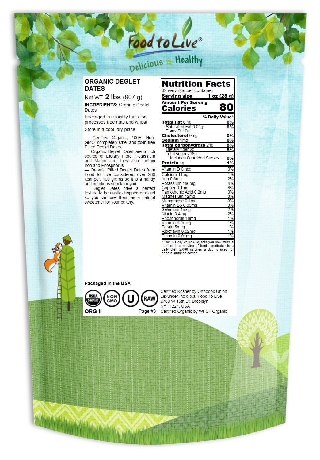 Organic Deglet Noor Dates by Food to Live are USDA Organic, Non-GMO and Kosher. Moreover, this product is 100% raw and is suitable for various diets including Vegan, Pescatarian, and Vegetarian.