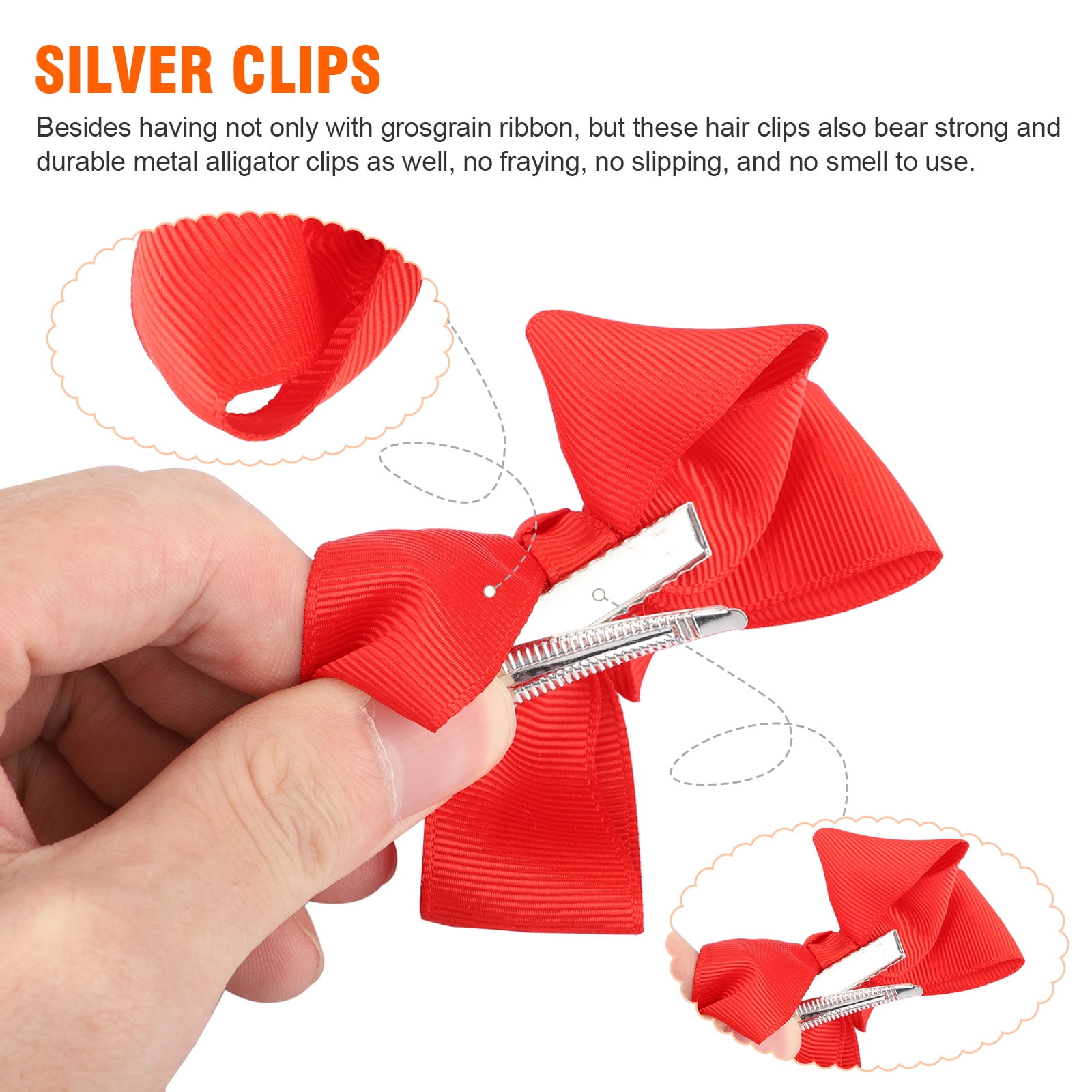 Silver Clips: Besides having not only with grosgrain ribbon, but these hair clips also bear strong and durable metal alligator clips as well, no fraying, no slipping, and no smell to use.