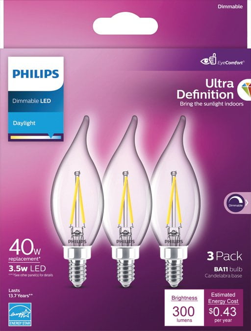 Philips Ultra Definition LED 40-Watt BA11 Filament Candle Light Bulb, Clear Daylight, Dimmable, E12 Candelabra Base (3-Pack)