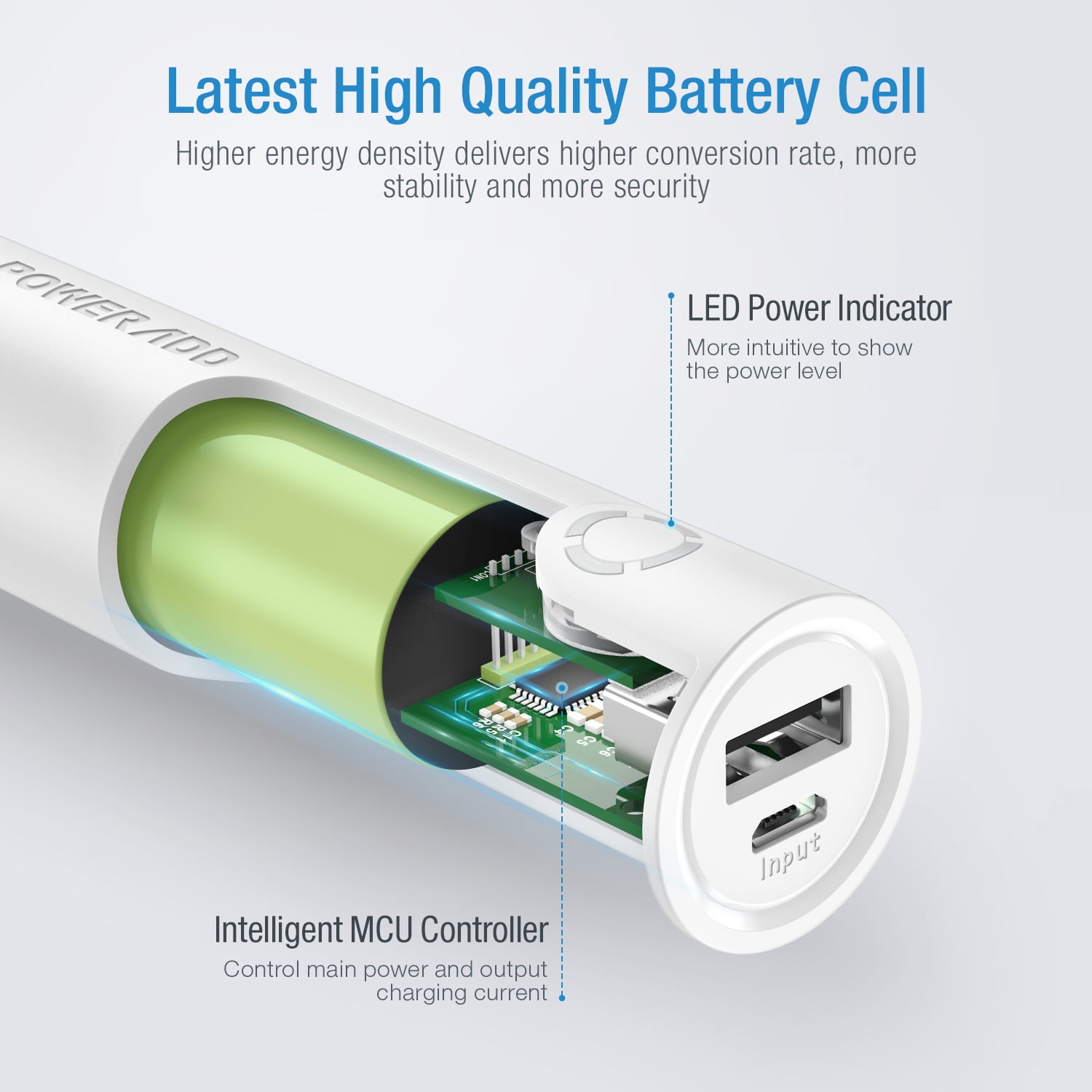 This mini power bank with high capacity of 5000mAh, slim, light weight design, only 3.1 ounces, easily put into your pocket, bag. This slim 2 power supply is ultra slim designed with 4.1*1.1 inch size and ultra slim body design is very easy hold. Perfect ideal for who prefer a ultra-compact, lightweight and also stylish charger. Provide 0-25%-50%-75%-100% Flower LED Indicate, you can see the remaining battery Clearly. Smart detect the current devices to provide its fastest intended charging speed up to 2.4A . It is very simple to charge your devices. Designed with 2.4A output current, provide the fastest charging speed up to your smartphones, tablets and more,Much faster than 1A/2A output. Slim 5000mAh provide two charges to an iPhone 6s or at least one to a Galaxy S7. Remarkably small, tubular design slides easily next to your phone in any pocket or bag. Just 10.5cm tall and 2.6cm wide.Equipped with exclusive fast charge, it provides the fastest charge to any phone or tablet (up to 2.4A output), Charge iPhone xs in only 1.5 hours, Samsung Galaxy s9 & HUAWEI Mate 20 in about 2 hours.
