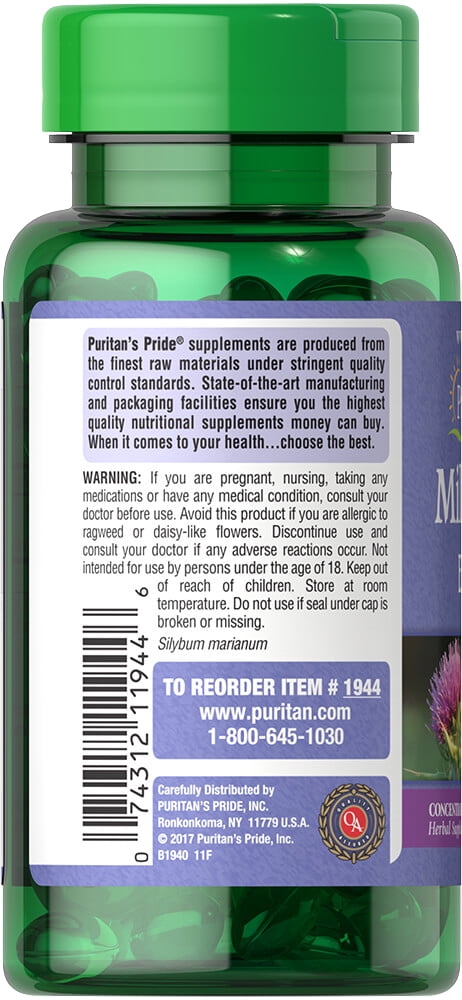 Milk Thistle, derived from a purple flower, has been used in Greek practices for thousands of years. The exceptional benefits of Milk Thistle are due to its antioxidant properties, which help to optimize health and well being. Milk Thistle helps maintain healthy liver function by supporting the structure of the outer cell membrane of liver cells. Adults can take one softgel once or twice daily. Directions: For adults, take one (1) softgel once or twice daily, preferably with a meal. Other Ingredients: Gelatin, Soybean Oil, Vegetable Glycerin. Contains <2% of: Natural Caramel Color, Soy Lecithin, Titanium Dioxide Color.