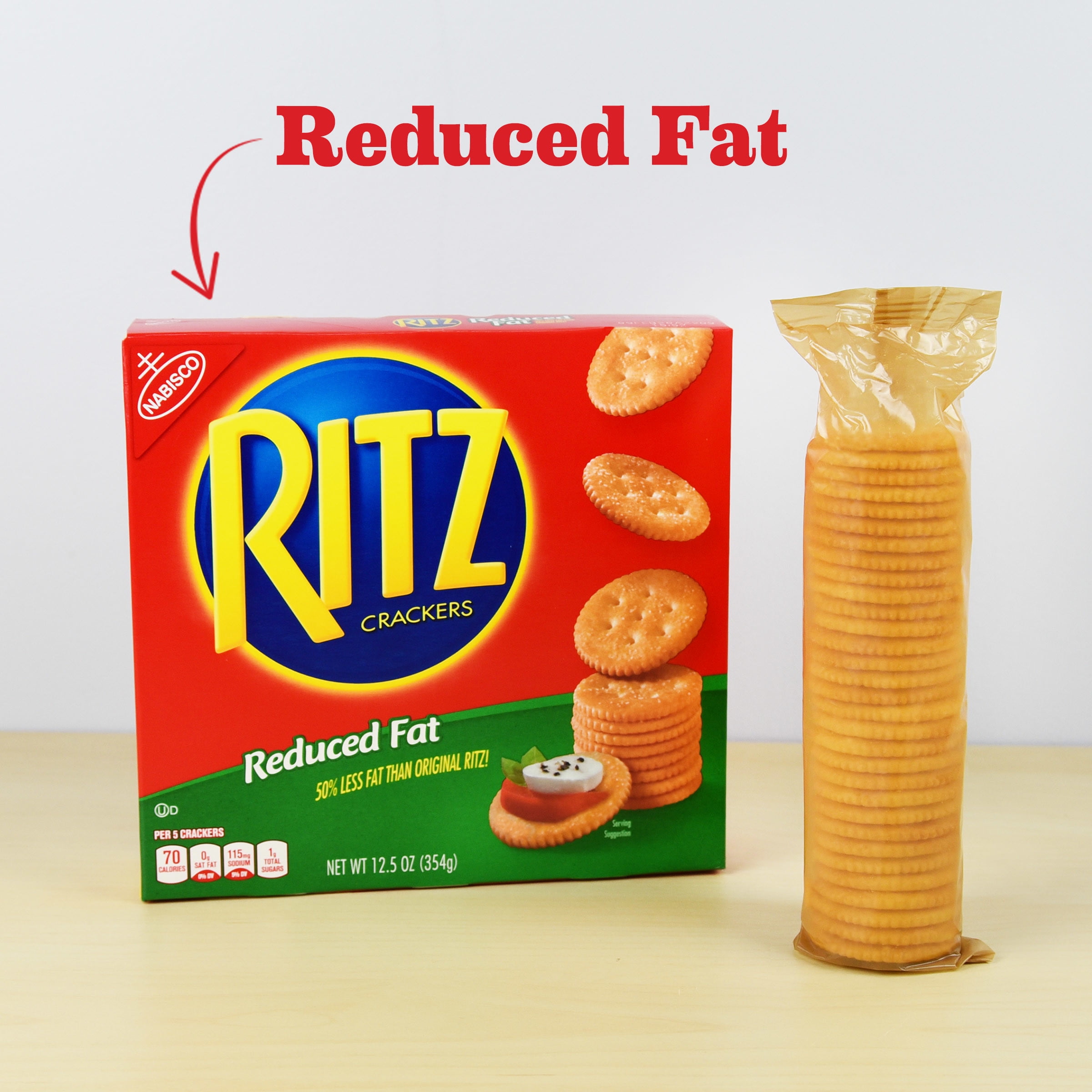 RITZ Reduced Fat Original Crackers are the same flaky and delicious RITZ recipe you love, with 50 percent less fat than Original RITZ. Each serving of five crackers contains 2 grams of fat. These RITZ snack crackers have a classic taste that pairs well with almost any topping. Add RITZ crackers to a cheese and crackers platter as a delicious appetizer, or top these rich, salty crackers with fruit and vegetables as a decadent dessert. RITZ reduced fat crackers are delicious all on their own too, so keep them on your salty snack shelf for an easy anytime treat. Each 12.5 ounce box contains individually wrapped sleeves to lock in freshness and flavor.