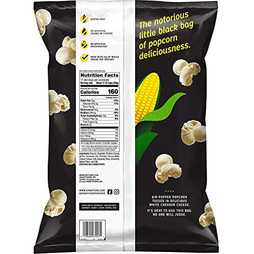 if you love smartfood’s popcorn and you love cheese, smartfood white cheddar cheese popcorn is a delicious choice. made with real white cheddar cheese, it’s bursting with amazing cheese flavor in every air-popped bite. best of all, smartfood white cheddar popcorn is made with no artificial colors, flavors or preservatives. this 100% whole grain popcorn is also gluten free.