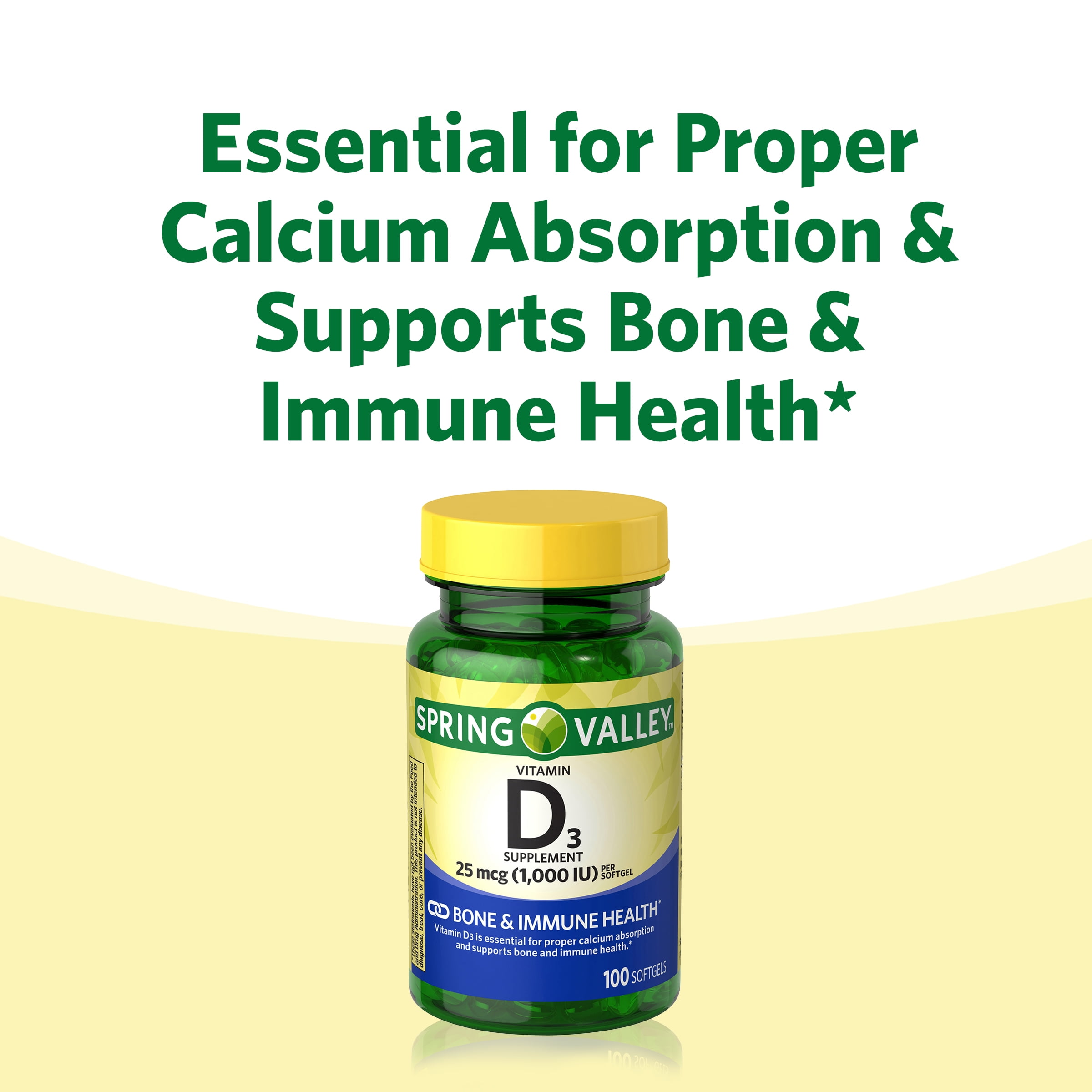 Welcome the Vitamin D you need every day with the Spring Valley Vitamin D3 1,000 IU Vitamin Supplement. D3 is a potent and active form of Vitamin D, which is essential for calcium absorption, bone health, immune health and healthy teeth.* The human body can produce Vitamin D3 naturally, when the skin is directly exposed to sunlight. Even though the sun can be a great source of the D3 Vitamin, for various reasons, it may be difficult for people to get an adequate amount from the sun alone. Spring Valley Vitamin D3 softgels are an easy and reliable way to help fulfill your daily needs.* These Vitamin D supplements are gluten free, dairy free and non-GMO. Spring Valley D3 Vitamins contain no artificial colors or flavors. Spring Valley understands living a healthy, balanced lifestyle is the key to being your best self. With an affordable range of products inspired by nature, Spring Valley supports your and your family’s health and holistic wellbeing. Adults should take one Vitamin D3 25 mcg softgel bone supplement daily, preferably with a meal. *These statements have not been evaluated by the Food and Drug Administration. This product is not intended to diagnose, treat, cure or prevent any disease.