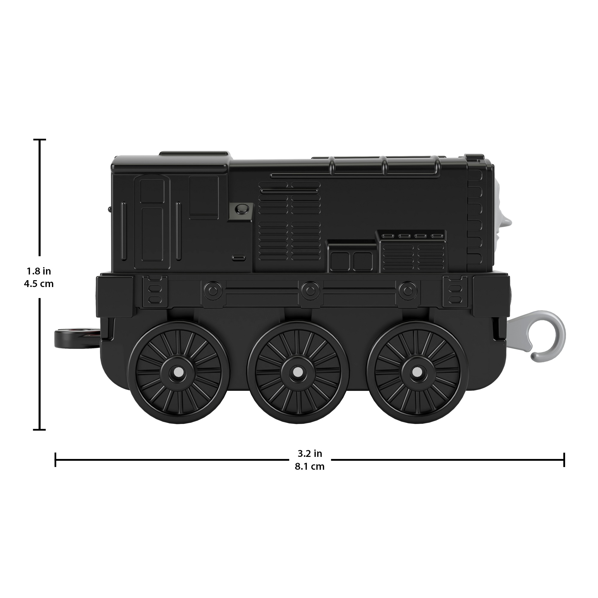 - Push-along, die-cast Diesel train engine with take-along storage shed