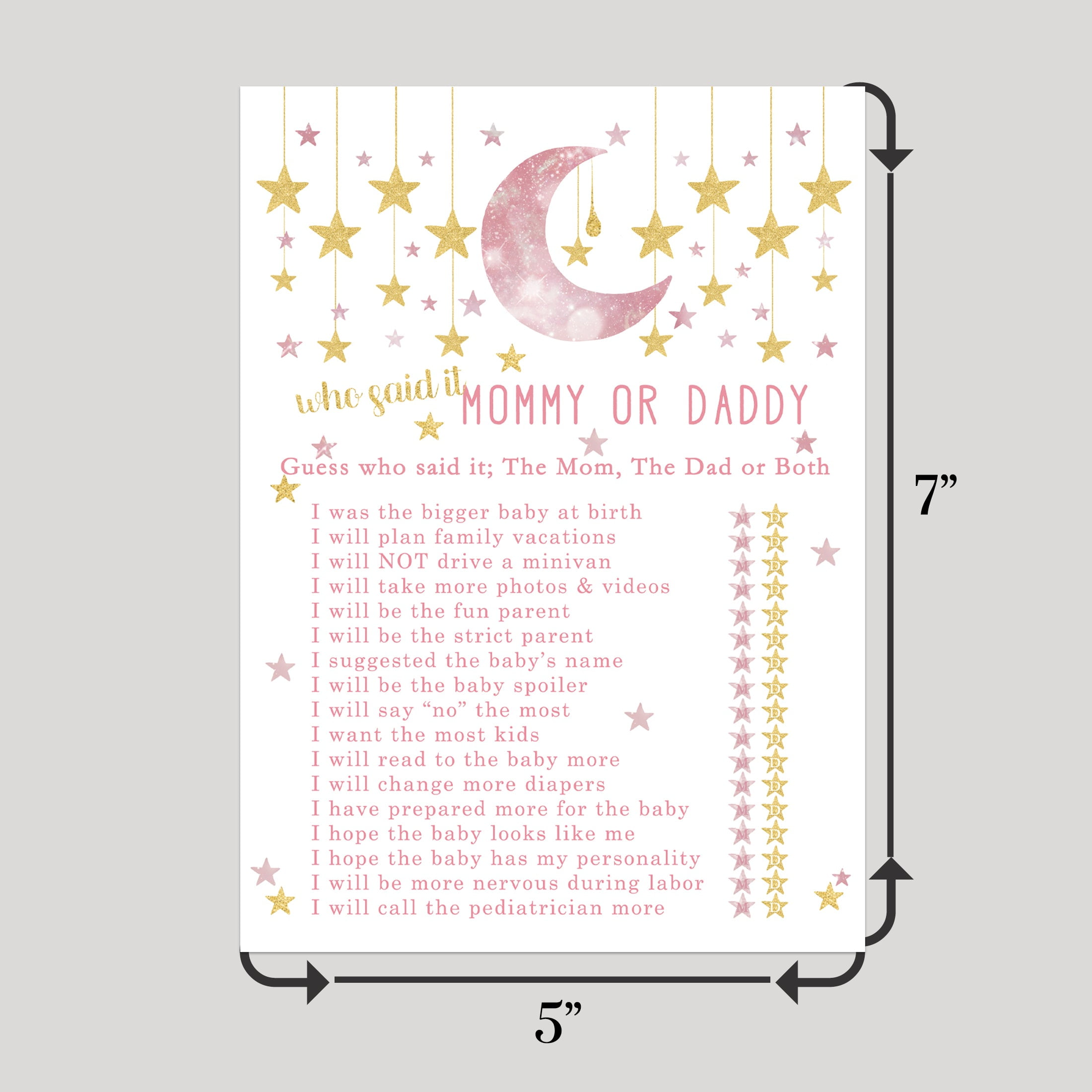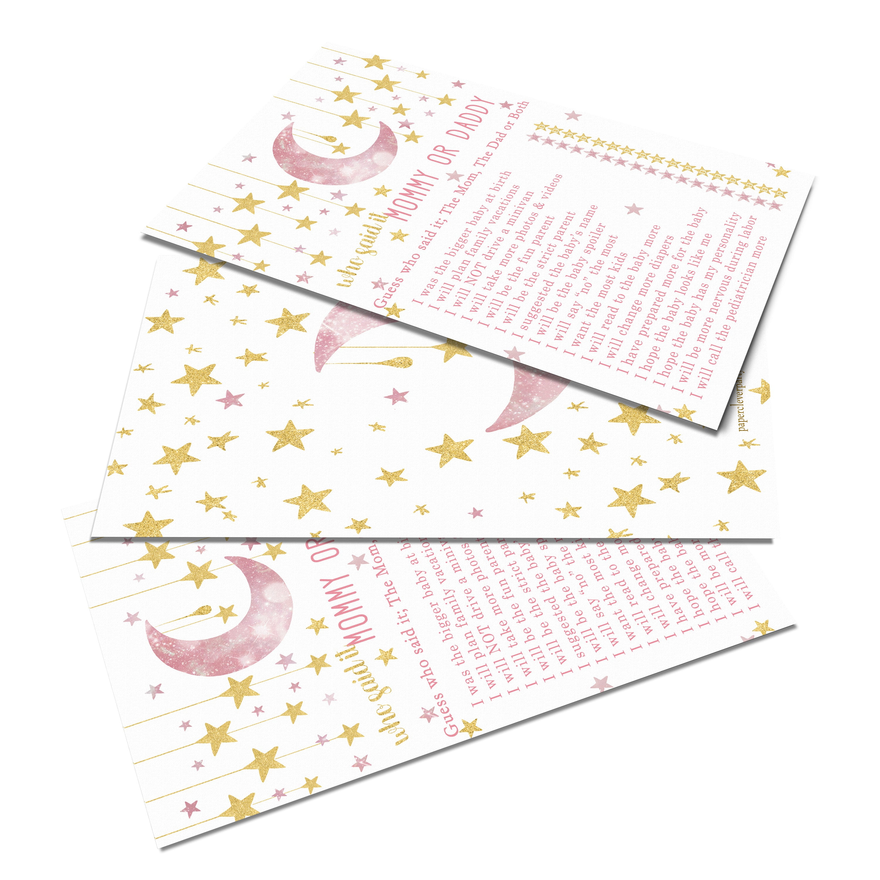Twinkle Little Star Mommy or Daddy Baby Shower Game 25 Pack Guess Who Activity Cards – Pink and Gold Moon Theme – Printed 5×7 Size Set – Paper Clever Party