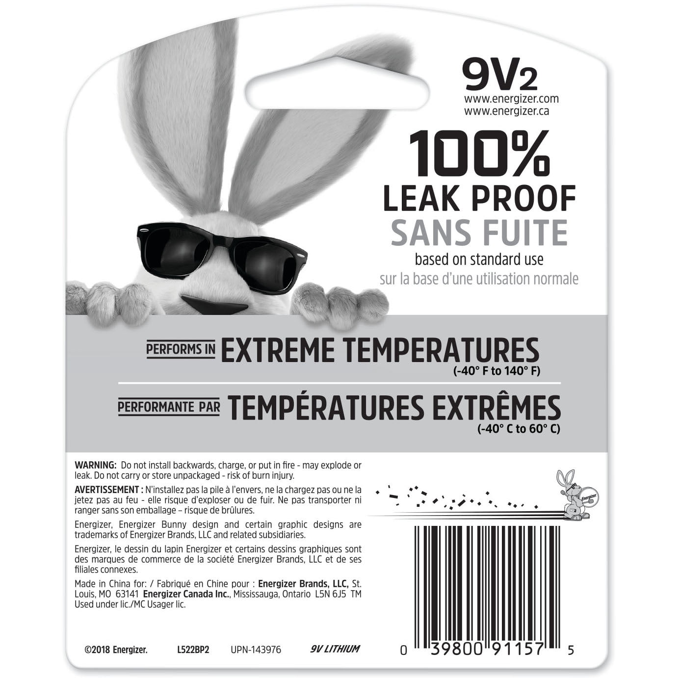 Energizer innovation delivers up to 10-year battery backup in AC-powered smoke detectors. This 9-volt lithium battery lasts up to 20 percent longer in toys vs. Energizer MAX batteries and weighs 1/4 less than a standard alkaline. It performs in extreme temperatures from negative 40 to 140 degrees Fahrenheit. Leak-resistant construction. See why nothing outlasts Energizer in high-tech devices, outdoor surveillance systems, digital cameras.