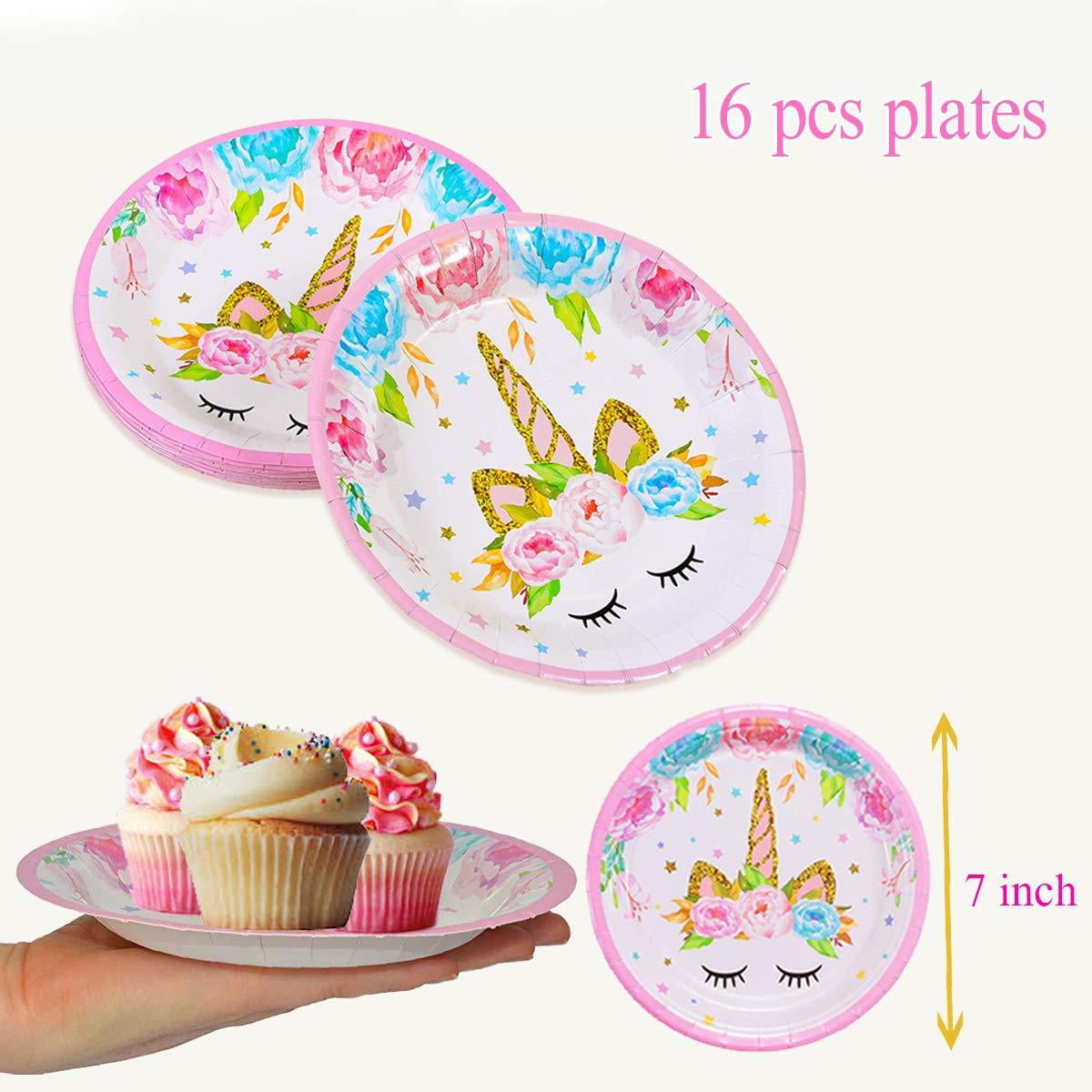 100% safe and non-toxic,bio-degradable and Eco-friendly unicorn design disposable paper party supplies set!Package including:16 pcs unicorn cake plates (7 inch)16 pcs unicorn napkins (6.5 inch)16 pcs unicorn paper cups (9 oz)16 pcs unicorn head for straw decoration24 sticker dots for straw decorationA pack of pink straws(25 pcs,7.9 inch)A unicorn tablecloth ( 70 X 42 inch) PLS NOTE: This style tablecloth size is 70”x42”, pls check whether it suit for your table. If it is too small,our store have bigger size for this style: 108" X 54",the link http:https://www.amazon.com/dp/B07PGW16BP, pls attention the tablecloth size.They are exactly what you are looking for a unicorn party supplies set!Save money and time on party! You can have a great deal price for such a big kit!Disposable party tableware set, no washing up, no cleaning, spend more time with your kids!Pls note: We support 100% MONEY BACK GUARANTEE:we want to sure that you enjoy your party with our unicorn party decorations set, if you have any unsatisfied, we offer a 100% money refund or a replace warranty! Any problems, pls contact us by " contact the seller",we will have a promptly reply,customer service is our number one priority!Wish you have a magic and unforgettable party!Dream Unicorn Party for Your Girl: All the items in the set are the same unicorn design,vivid,colorful and super cute, so adorable unicorn party supplies set will be a hit on your little princess’ birthday party.This unicorn party decoration set made setting up your party table so easy and special! Perfect Set for Your Unicorn Party Table Decoration: Package including 16 pcs unicorn cake plates,16 pcs unicorn cups,16 pcs unicorn napkins,16 pcs unicorn head decorations for straw, a pack of straw (25pcs), a unicorn tablecloth. Totally can serve 16 guests for your party. Add Additional Fun to Your Party: The pretty unicorn head decorations for the straw,You will get some sticker dots to glue them on straws,added a perfect crafts activity to entertain at the party.We can imagine how excited your child will be to see the amazing straw decorations turn their cup in to a UNICORN! High Premium Quality: Our cute unicorn birthday party supplies disposable set are made from 350gsm paper,stability and durability there is no need to worry about flimsy bends and leaks. Best of all,they’re 100% safe and non-toxic,bio-degradable and Eco-friendly. Exactly What You Want for Party Supplies: Very well made with beautiful color and fancy design unicorn party decoration set, it is perfect for your girls birthday party table decorations,or use it for baby shower,first birthday party,picnics,Christmas,get-togethers,outdoor events and more.Make a beautiful and memorable party with our cute unicorn party supplies set!