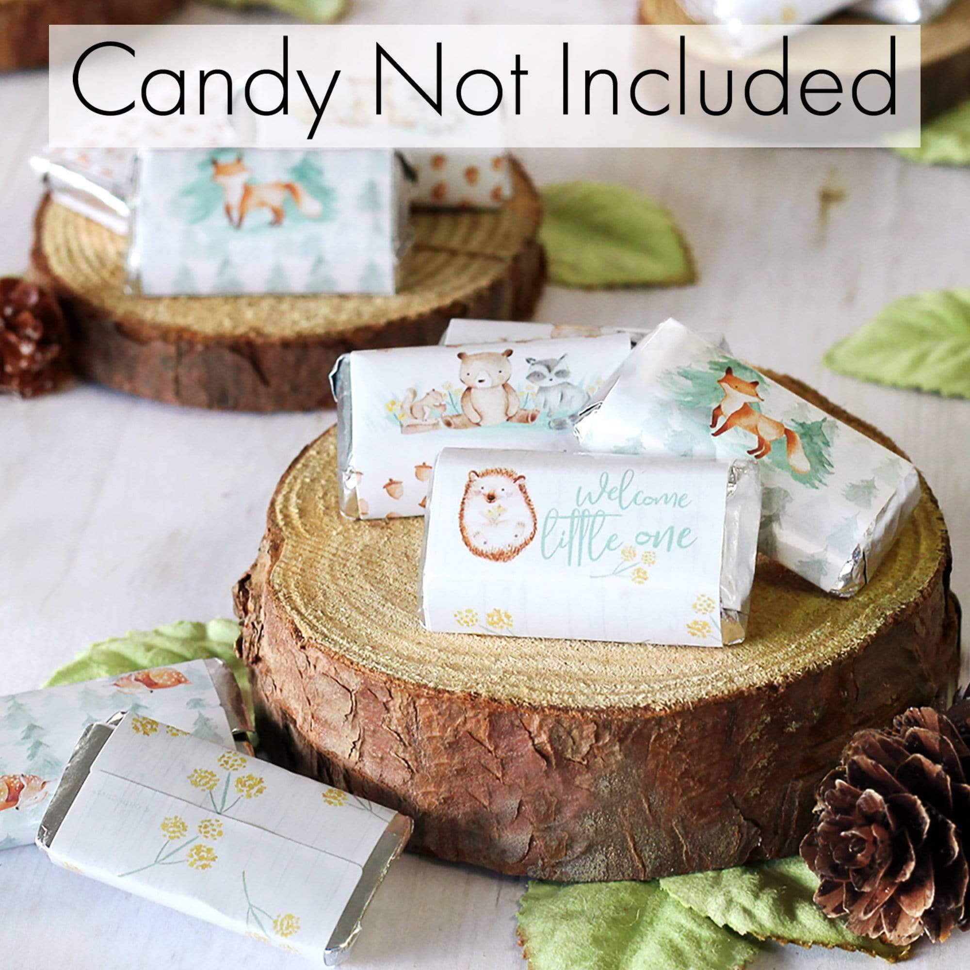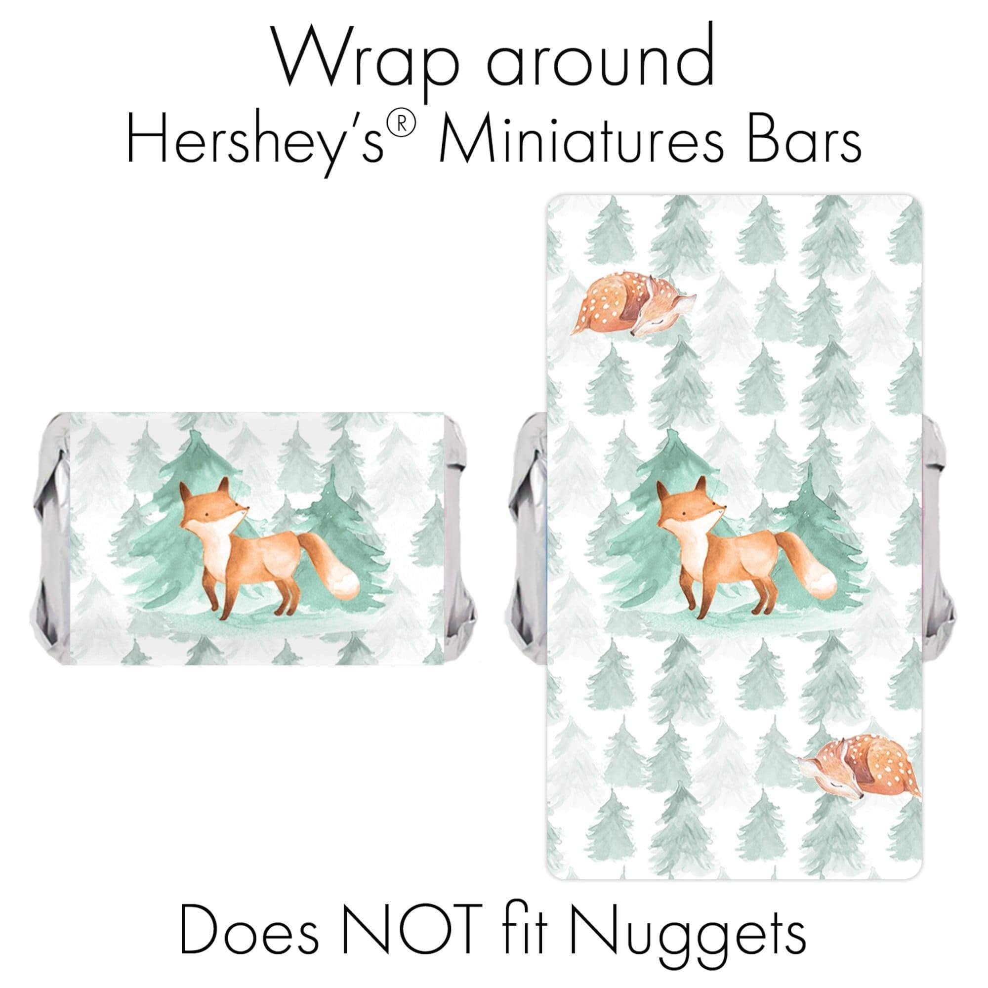 - CANDY NOT INCLUDED. 1.45" x 2.65" stickers wrap on Hershey’s Miniatures candy bars for woodland animals fox and bear baby shower favors.