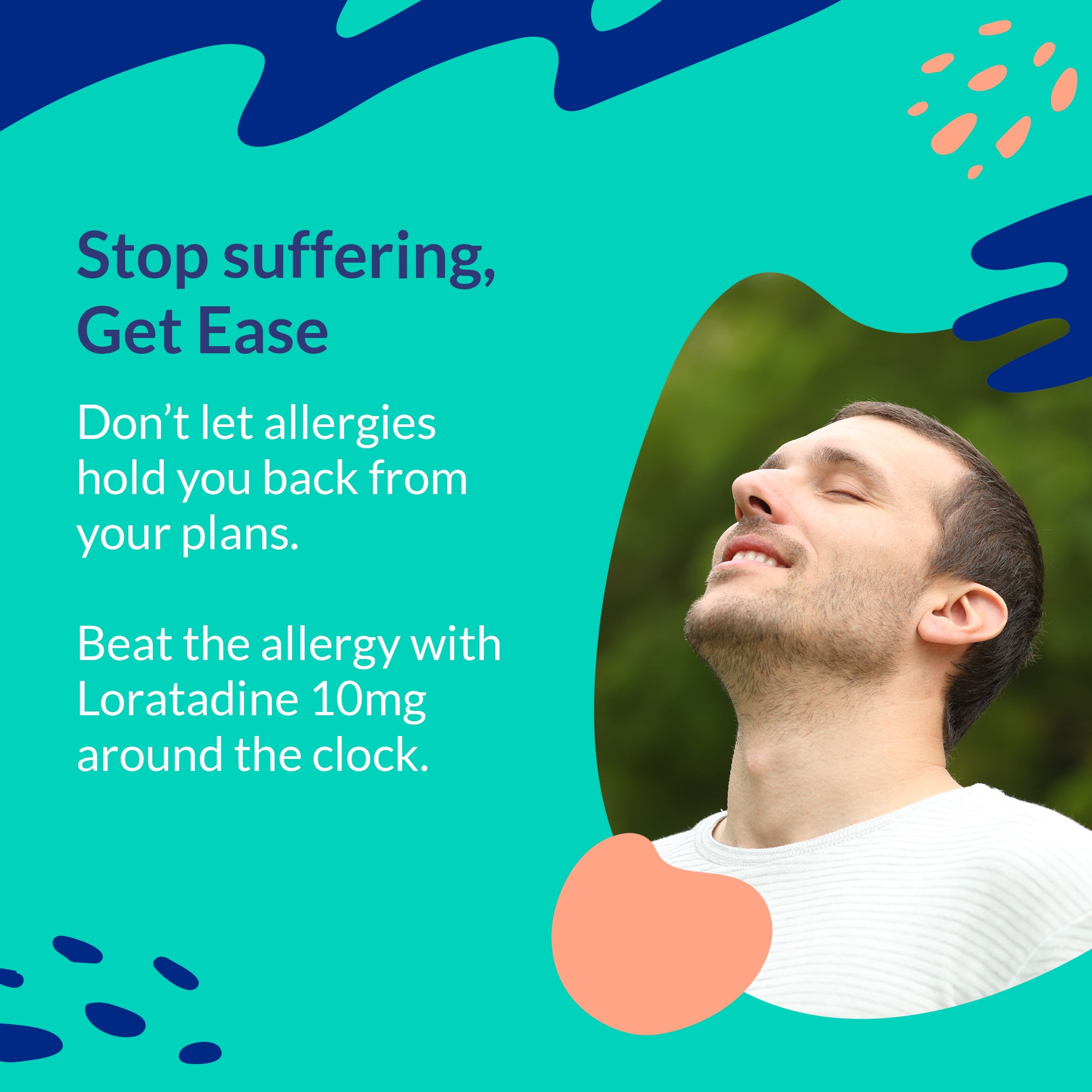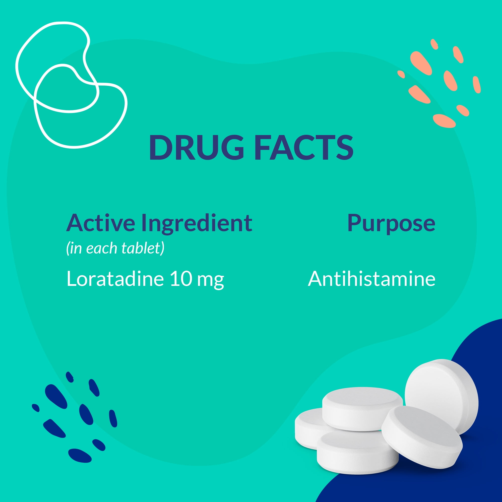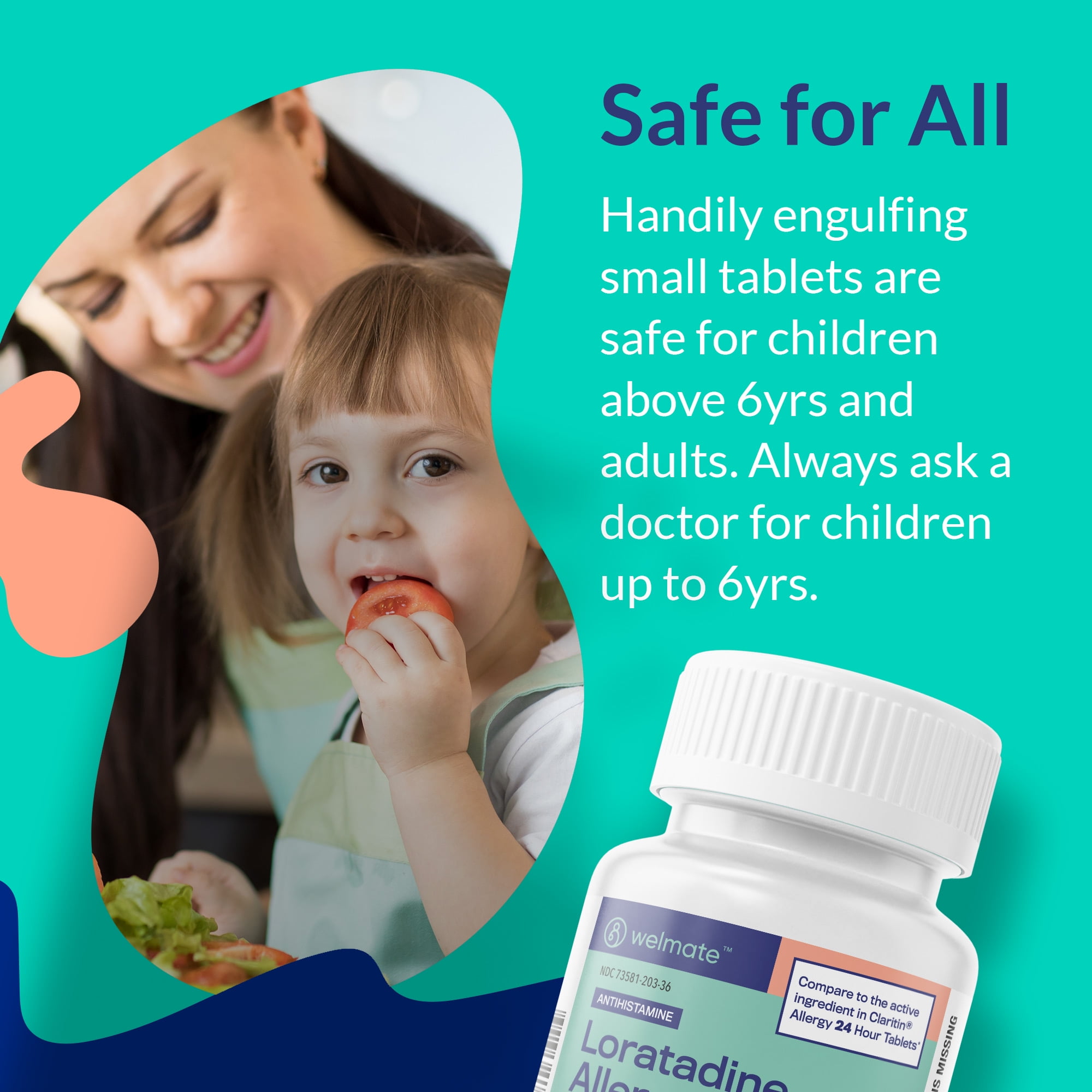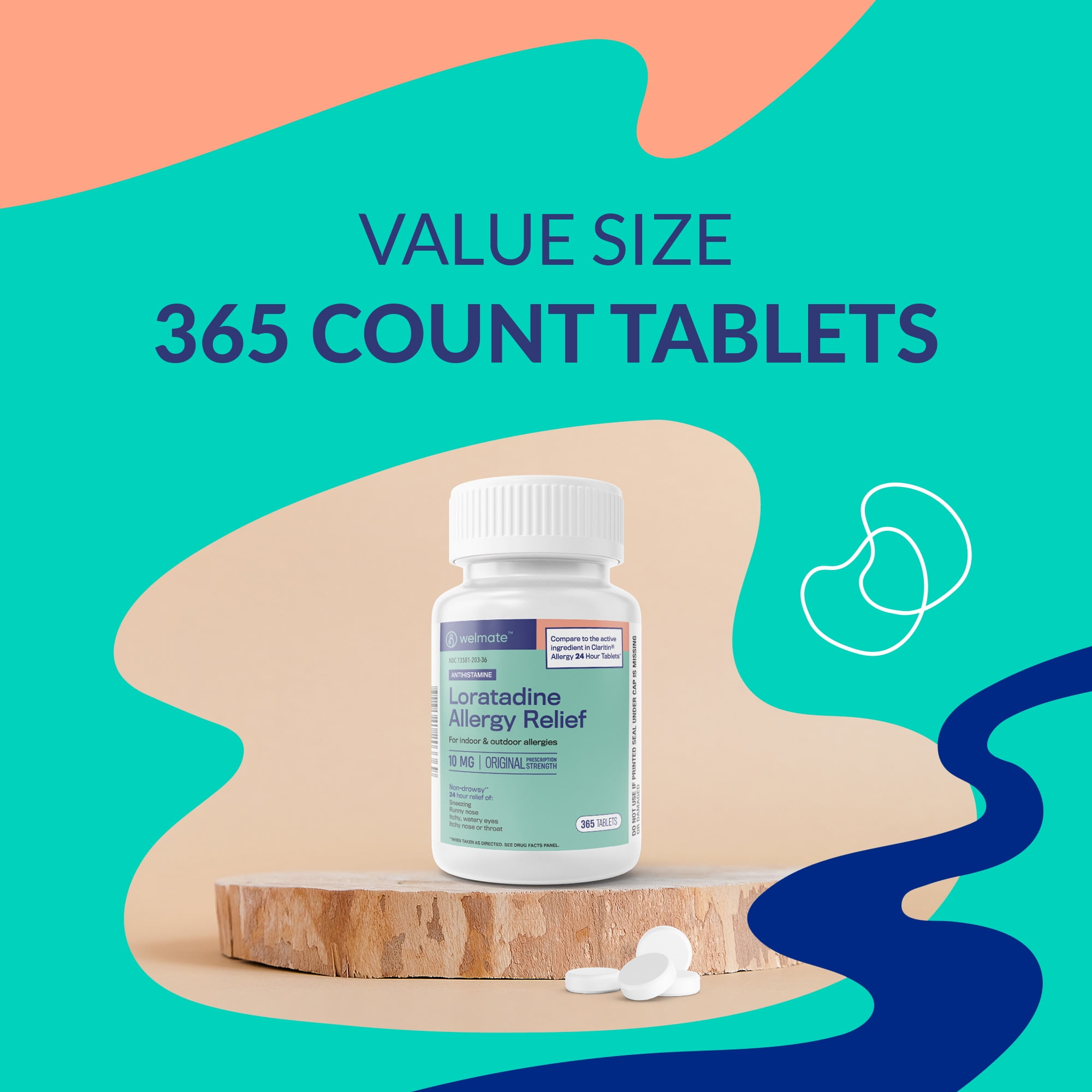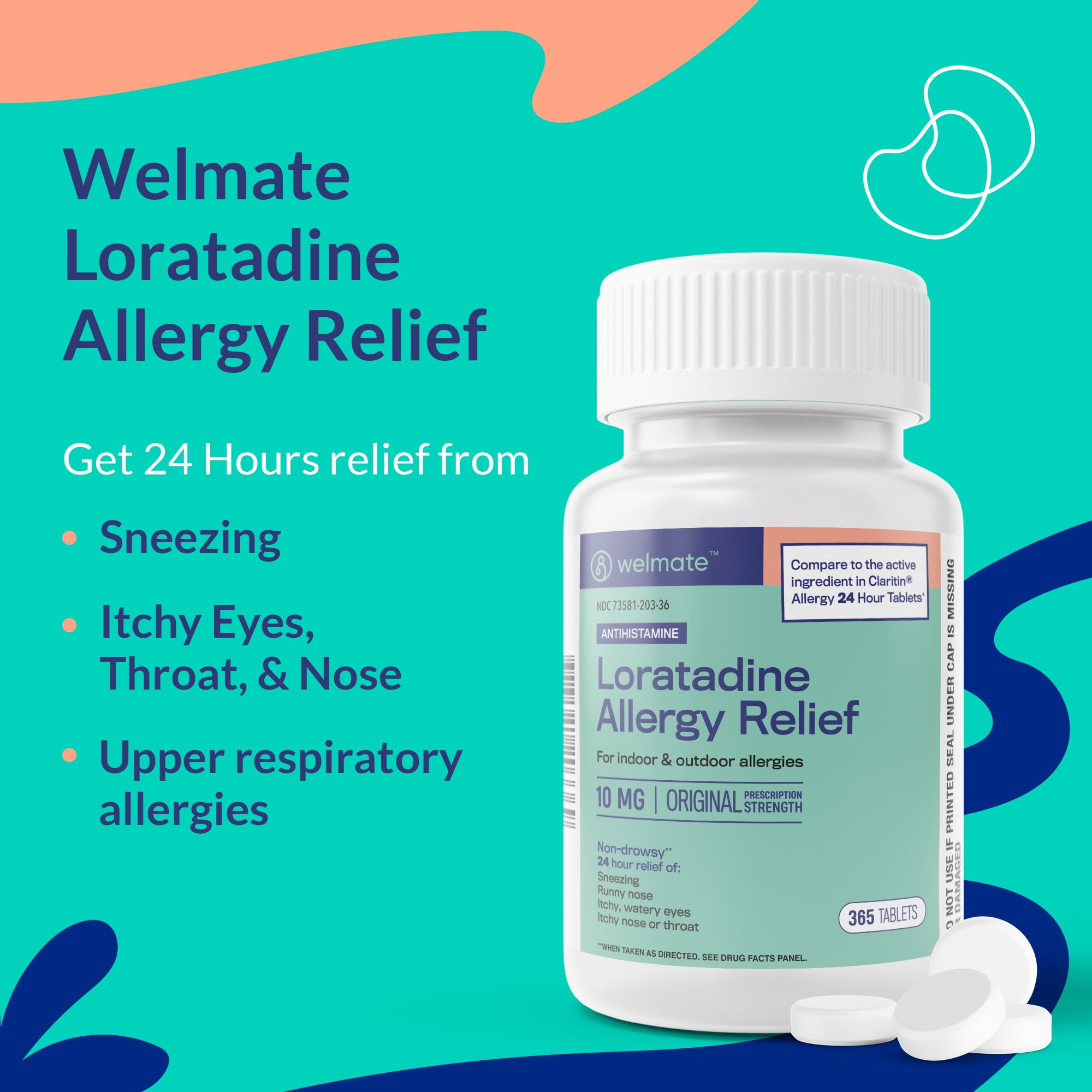 Compare to Claritin active ingredient. With non-drowsy allergy relief from Welmate Loratadine Tablets 10 mg, you can stop sniffling and enjoy spring without the dreaded symptoms of seasonal allergies. Pet dander, mold or dust? No problem. One dose provides all day, 24-hour relief of sneezing, runny nose, itchy or watery eyes, and itchy throat or nose from indoor or outdoor allergens. The active ingredient is loratadine 10 mg, a powerful antihistamine in original prescription strength. Get allergy relief without the sleepiness. These tablets will not cause drowsiness when taken as directed. For adults and children 6 years and over.