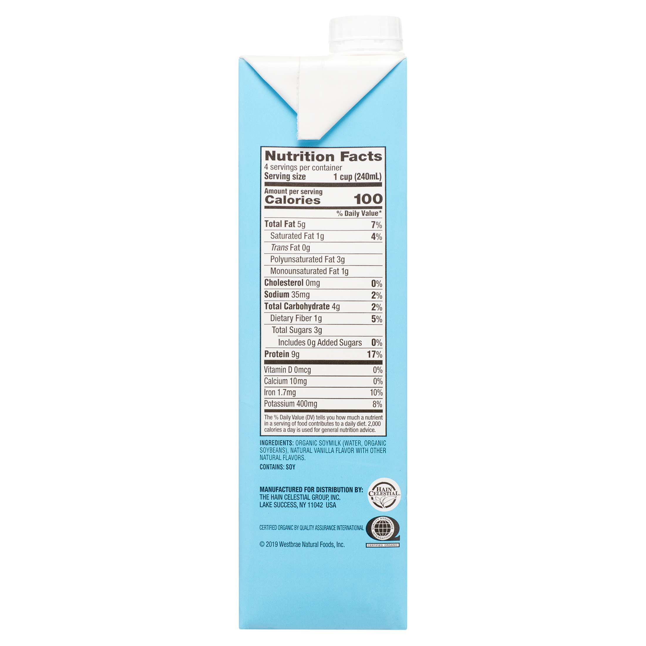USDA Organic Certified and Non-GMO Project Verified, WESTSOY® Organic Unsweetened Vanilla Soymilk is made from whole organic soybeans and a touch of natural vanilla flavor. Smooth and creamy, with 9g of protein per serving, it’s deliciously nutritious and heart smart. Enjoy by the glassful, over cereal, or in your favorite recipe to add the delectable flavor and benefits of soy to your nutritious dietWESTSOY ORGANIC UNSWEETENED VANILLA PLANT BASED BEVERAGE IS LACTOSE- AND CHOLESTEROL-FREE. LOW IN SATURATED FAT, OUR PLANT-BASED BEVERAGE IS HEART HEALTHY. WE USE INGREDIENTS THAT ARE CERTIFIED NON-GMO. THIS PRODUCT IS SUITABLE FOR GLUTEN-FREE AND VEGAN DIETS. THIS PACKAGE HOLDS 32 FL. OZ. OF OUR UNSWEETENED PLANT-BASED BEVERAGE.