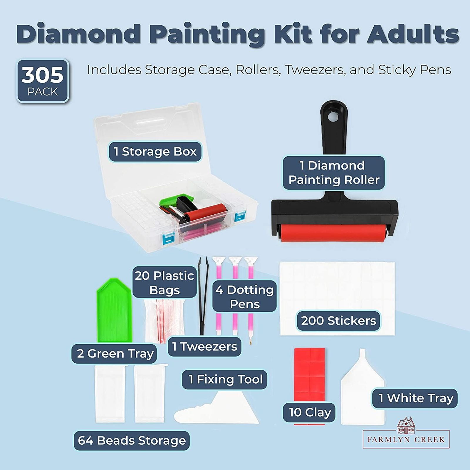 305 Pcs Diamond Painting Kit with Embroidery Storage Box, Rollers, Tweezers, Sticky Pens, Cross Stitch Tools