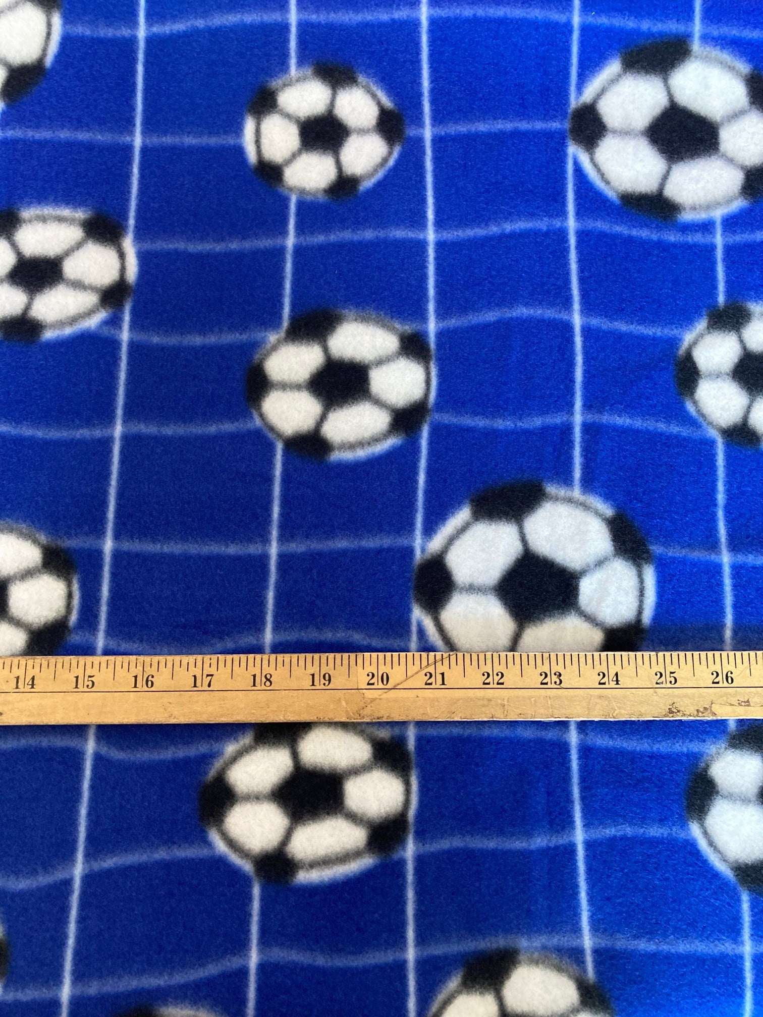 Lilly Craft Soccer Balls and Net on Royal Blue Fleece Fabric 58-60′ Wide Sold by the Yard