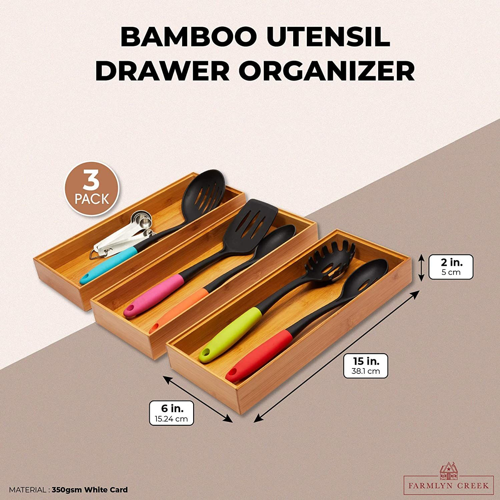 3-Pack Bamboo Utensil Drawer Organizers Cutlery Tray for Kitchen Silverware Flatware Brown 15’x6’x2′