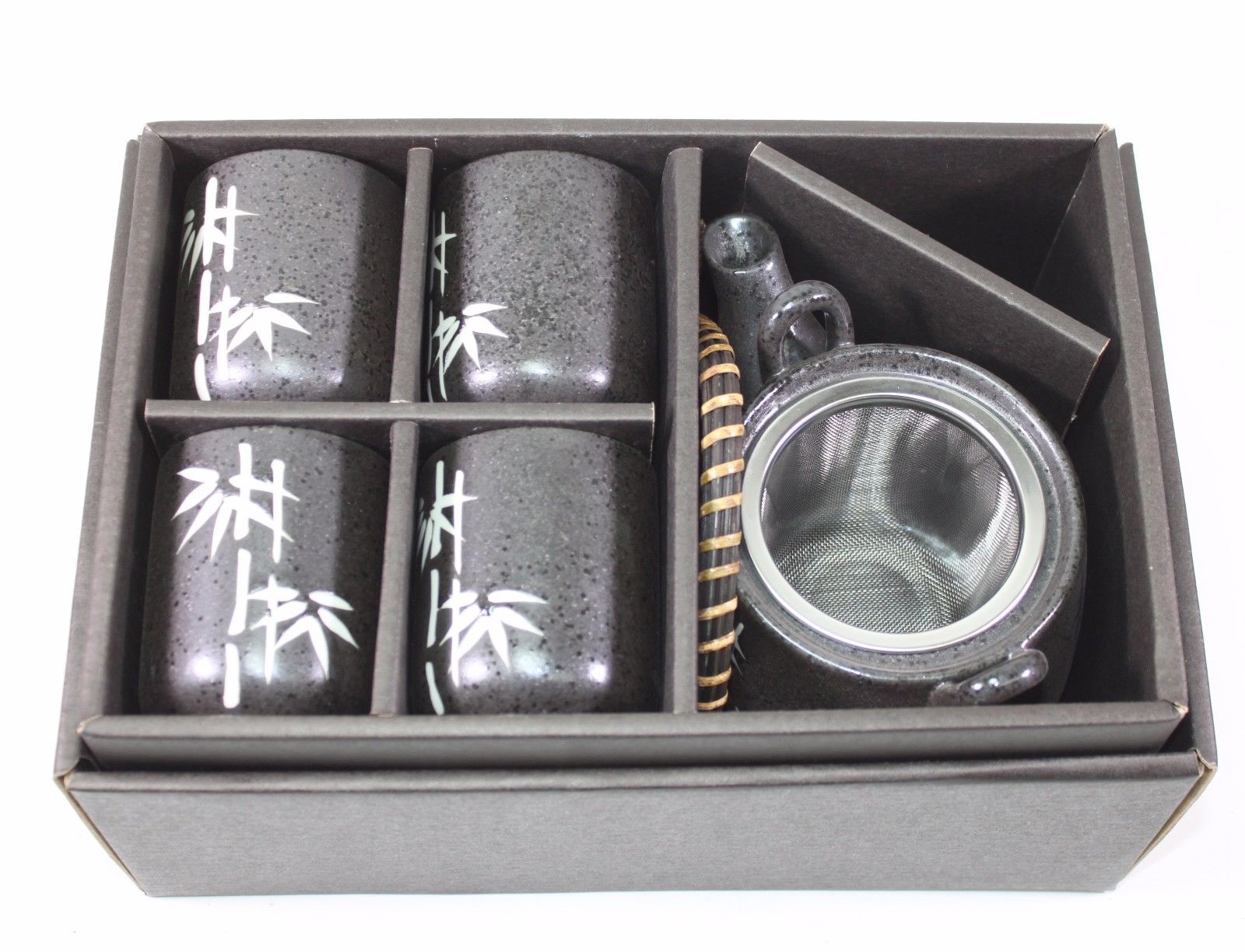 6′ Black Bamboo Rattan Japanese Ceramic Tetsubin Teapot Teacups Infuser Tea Set