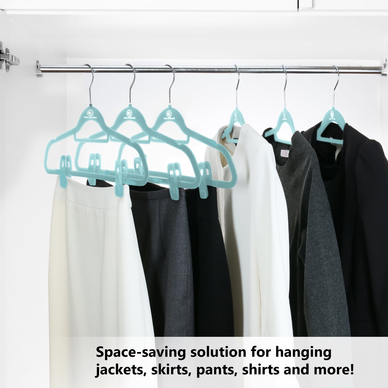 Closet Accessories, Velvet Hangers, Non-Slip Ultra Slim Space Saving Hanger, with notches, tie bar, and Swivel Hooks, 30 Pack, with Bonus 20 Matching Velvet Finger Clips. Blue (Aqua)