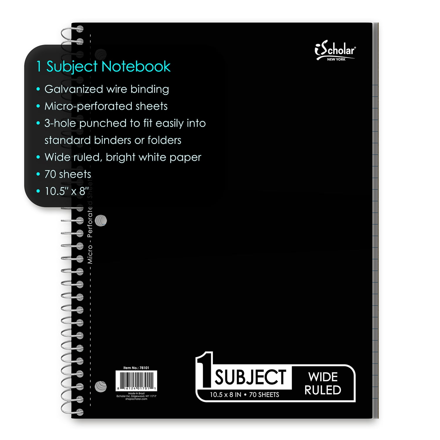 iScholar 1 Subject Notebook, 10.5′ x 8′, Wide Rule, 70 Sheets, Black (78101-BK)