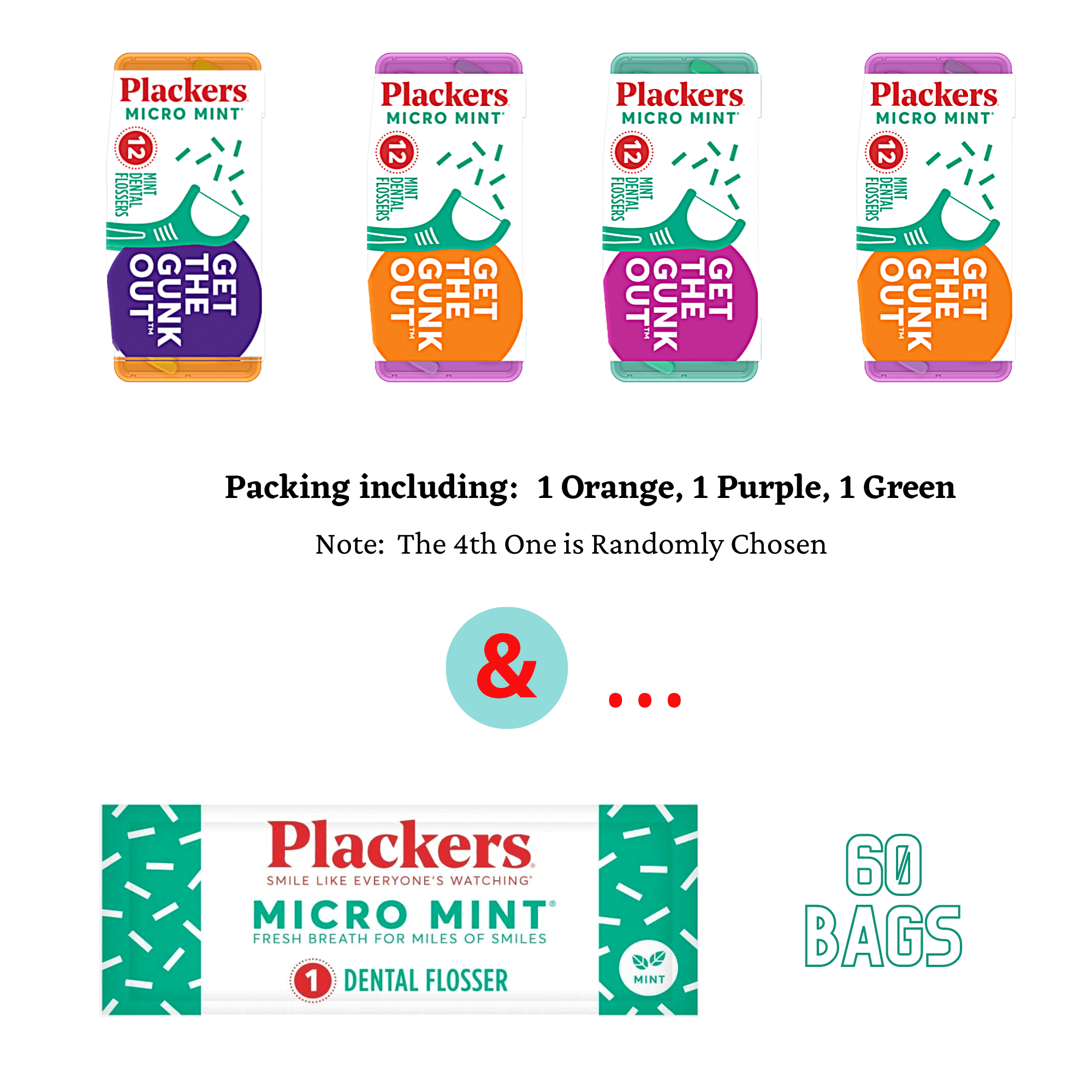 Plackers Individually Wrapped Micro Mint Dental Floss Picks, 60 Count with 4 Travel Cases
