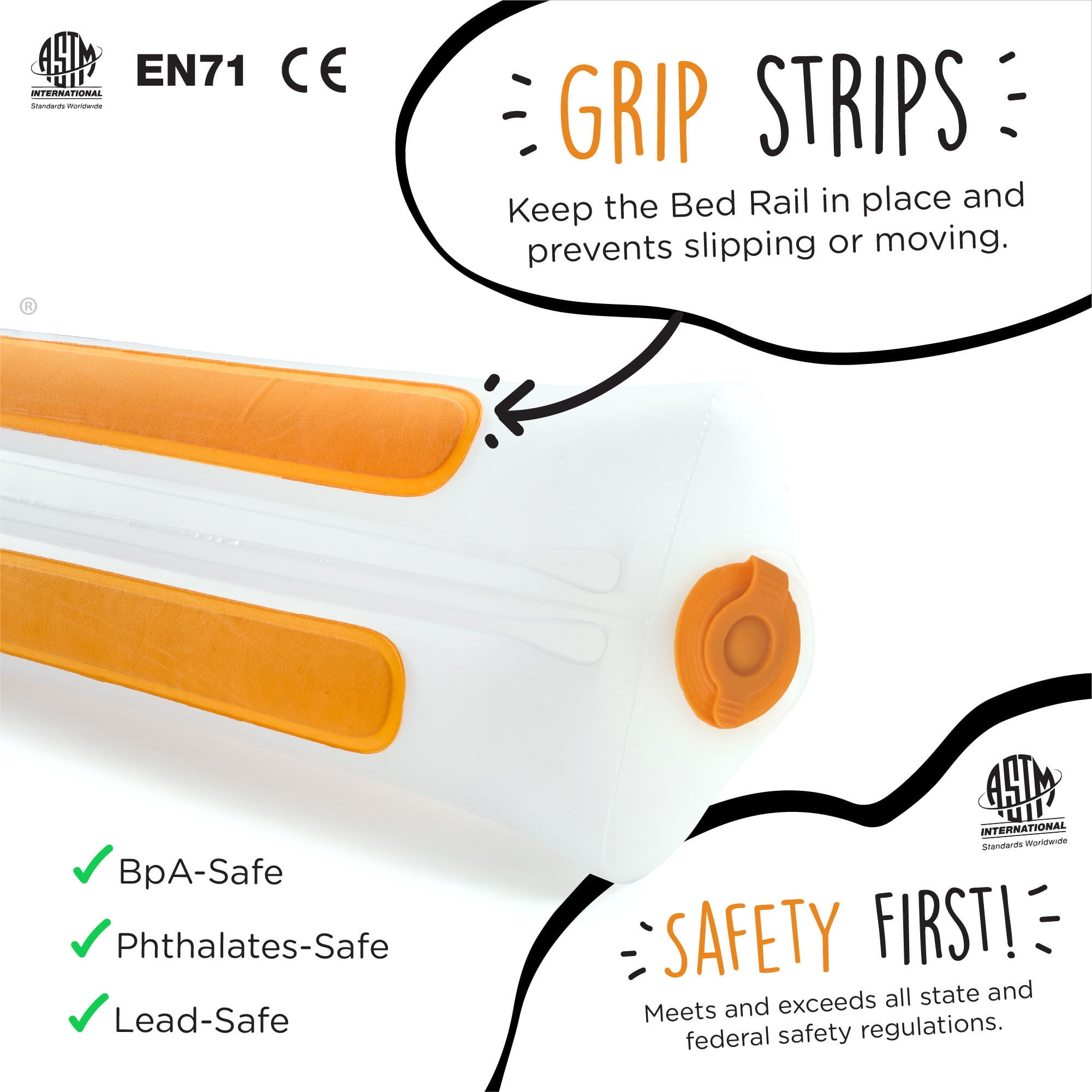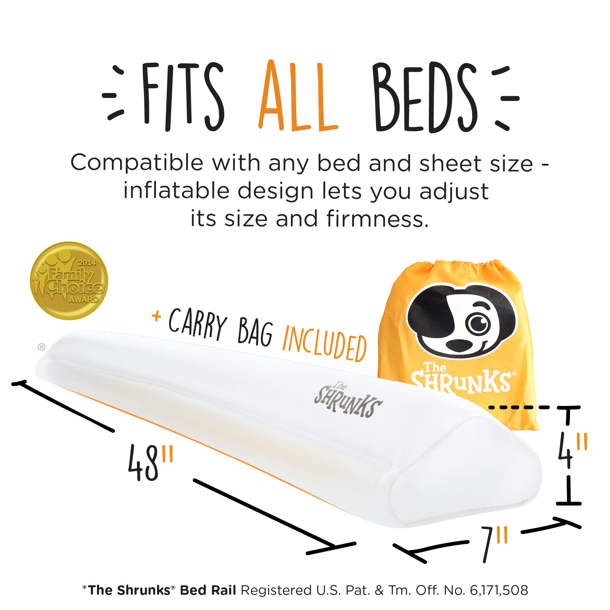 - STOP FALLING OUT OF BED: award winning Shrunks inflatable Bed Rail with stay put grip strips helps prevent little ones from rolling off the bed or getting wedged between the wall and the bed. When a child touches our bed rail while sleeping, they are subconsciously reminded to shift to the middle without interrupting their peaceful sleep. Shrunks stay-put grip strips keep our bed rail securely in place without difficult to use straps, attachments or uncomfortable fabric that can bunch up.