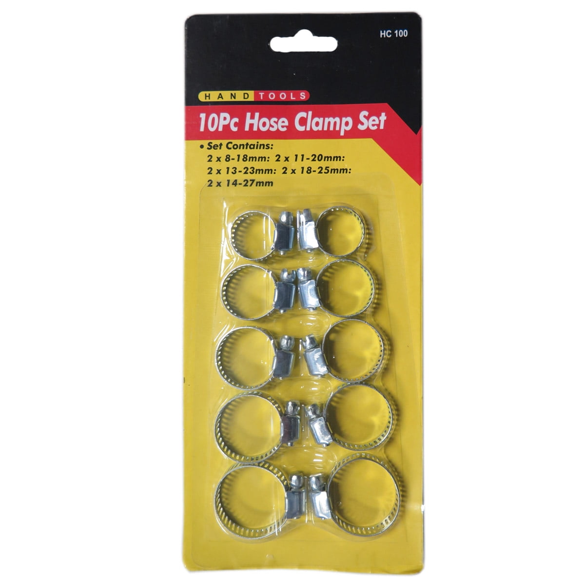 Set contains: 2x 8-18mm, 2x 13-23mm, 2x 14-27mm, 2x 11-20mm, 2x 18-25mm10pcs Stainless Hose Clamp Set Worm Gear Type Hose Pipe Fitting Clamp Assortment