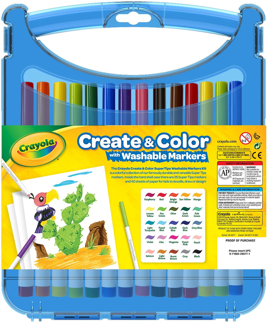 12 Scented Washable Markers Non Toxic Bright Assorted Colors Kids Coloring ArtOpen box to discover fun scents like Banana, Orange, Cherry, Grape, Fruit Punch, Kiwi, Chocolate, Blackberry, Blueberry and Raspberry. Wild collection of scents that’s sure to stir creativity.Scented markers have a molded narrow chisel tip which allows two line widths.Broad-line and Fine-line with just a twist of the wrist. Excellent for color, draw and write.Dries quickly and doesn’t bleed through most paper including thin papers; smear and smudge free.Durable tip lasts on rough surfaces.These water color markers are water-based and safe for children.Most clothing can be washed in warm or hot water.