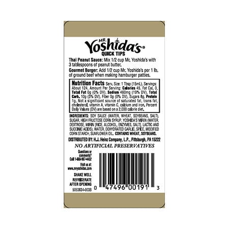 2 PACK | Mr. Yoshida’s Original Gourmet Sauce (86 oz.) bout this item -Sweet and savory sauce with Asian-inspired flavor -Works well in all types of cooking and compliment all kinds of food. -A versatile marinade and cooking sauce great for beef, pork, chicken, fish or vegetables. Specifications -No trans fat -No added MSG or artificial preservatives -Net weight: 86 oz. (5 Lbs. 6 oz.) 2.44 kg.2 PACK | Mr. Yoshida’s Original Gourmet Sauce (86 oz.)
