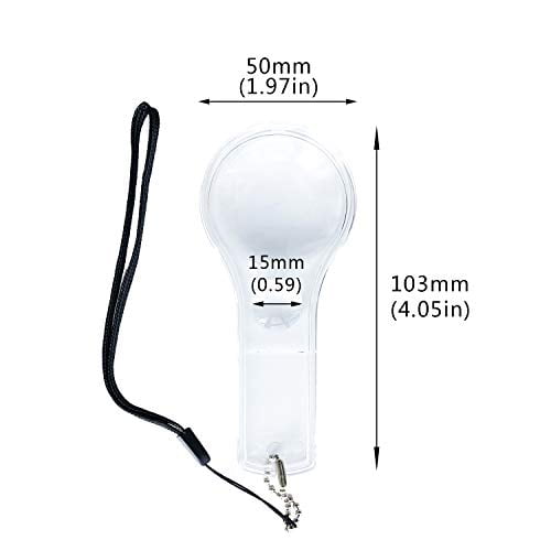 - Size: The bigger round lens diameter of the hanheld magnifier is 50 mm, and the lens magnifications: 5X; the snaller round lens diameter of the hanheld magnifier is 15 mm, and the lens magnifications: 15X