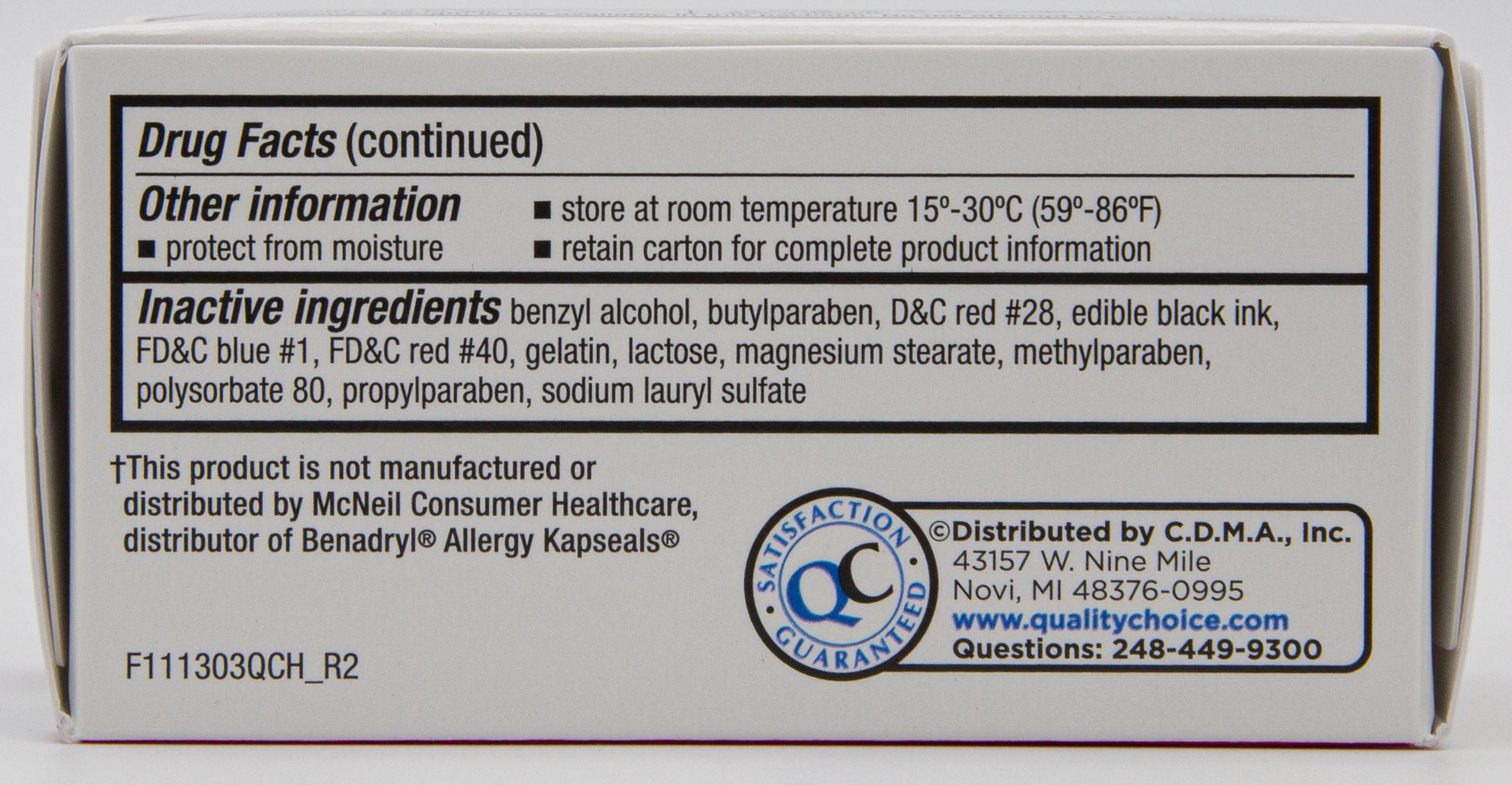 Quality Choice Allergy Relief is an Antihistamine for relief of sneezing, itchy, watery eyes, runny nose, and itchy throat, temporarily relieving symptoms due to hay fever or other respiratory allergies, and temporarily relieving symptoms due to the common cold. Compare the active ingredient, Diphenhydramine HCI (25mg) to that of other leading brand antihistamines. 100 capsules per package. From Quality Choice, the Brand You Trust. 100% Satisfaction Guaranteed. Quality Choice for a Quality Life.