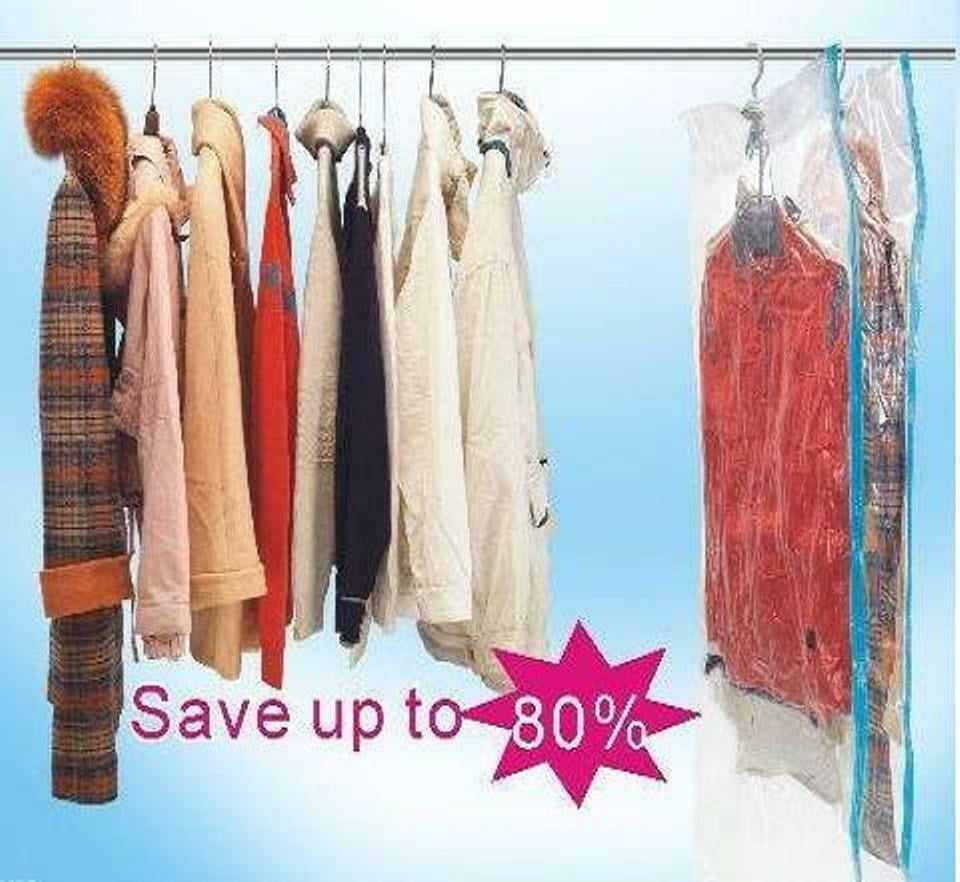 - 5 Pack Hanging Bags: This space-saving hanging vacuum bag helps to quickly compress and store seasonal clothing, suits, shirts and blouses, sport coats, jackets, pants, dresses, sweaters, formal wear and other bulky items. Vacuum needed with standard vacuum hose. The opening width of the hook is 1 inch.